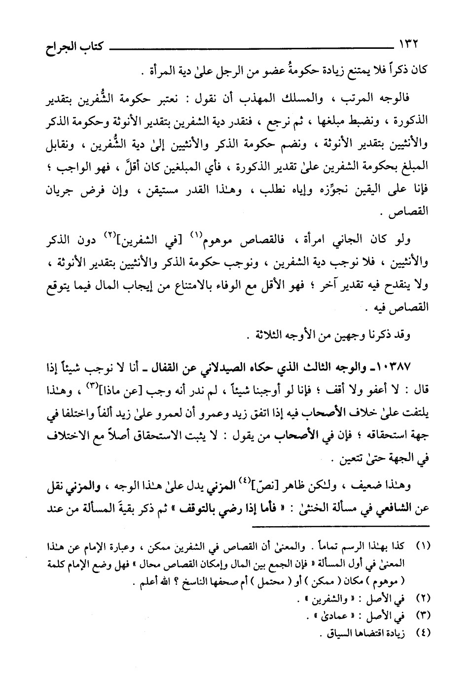 (1) كذا بهذا الرسم تماماً. والمعنى أن القصاص في الشفرين ممكن، وعبارة الإمام عن هذا المعنى في أول المسألة "فإن الجمع بين المال وإمكان القصاص محال" فهل وضع الإمام كلمة (موهوم) مكان (ممكن) أو (محتمل) أم صحفها الناسخ؟ الله أعلم.