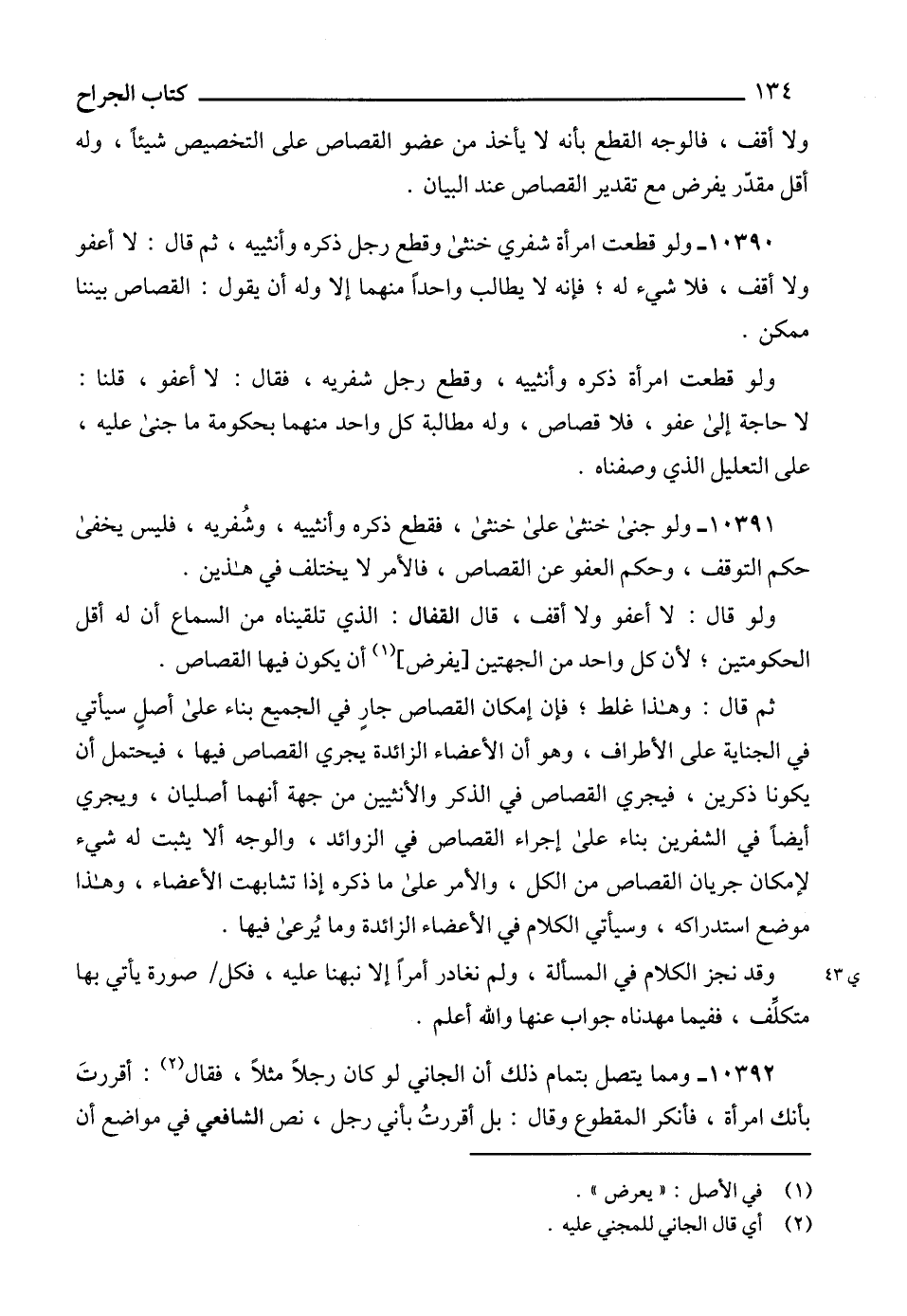 10390 - ولو قطعت امرأة شفري خنثى وقطع رجل ذكره وأنثييه، ثم قال: لا أعفو ولا أقف، فلا شيء له؛ فإنه لا يطالب واحداً منهما إلا وله أن يقول: القصاص بيننا ممكن.