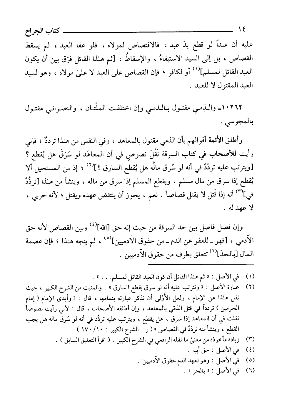 (2) عبارة الأصل: "وتترتب عليه أنه لو سرق يقطع السارق". والمثبت من الشرح الكبير، حيث نقل هذا عن الإمام، ولعل الأَوْلى أن نذكر عبارته بتمامها، قال: "وأبدى الإمام (إمام الحرمين) تردداً في قتل الذمّي بالمعاهد، وإن أطلقه الأصحاب، قال: لأني رأيت نصوصاً نقلت في أن المعاهد إذا سرق، هل يقطع، ويترتب عليه تردُّد في أنه لو سُرق ماله هل يجب القطع، وينشأ منه تردّدٌ في القصاص" (ر. الشرح الكبير: 10/ 170).