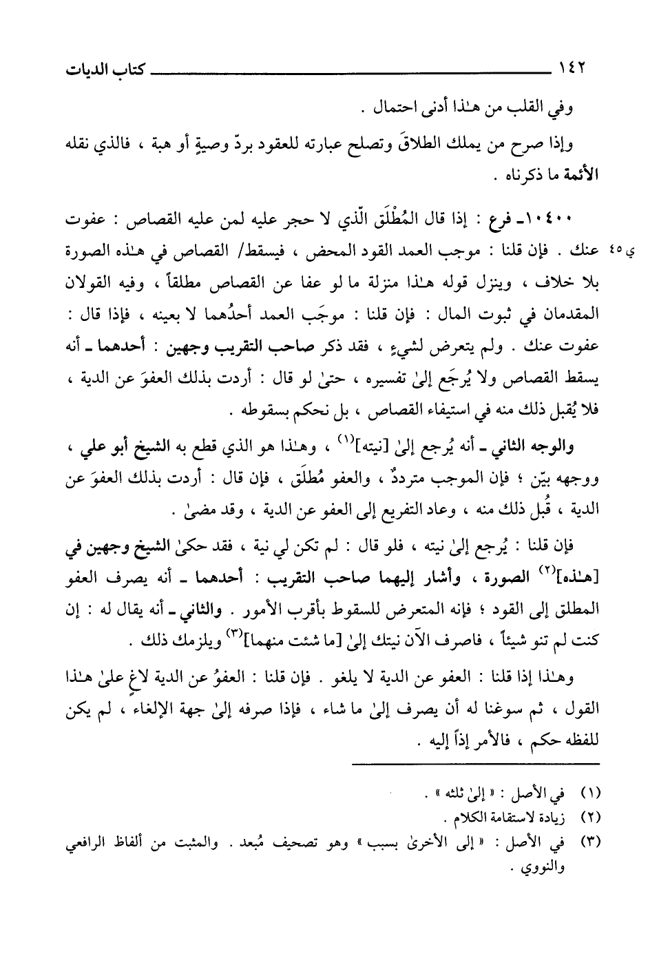 10400 - فرع: إذا قال المُطْلَق الّذي لا حجر عليه لمن عليه القصاص: عفوت عنك. فإن قلنا: موجب العمد القود المحض، فيسقط القصاص في هذه الصورة بلا خلاف، وينزل قوله هذا منزلة ما لو عفا عن القصاص مطلقاً، وفيه القولان المقدمان في ثبوت المال: فإن قلنا: موجَب العمد أحدُهما لا بعينه، فإذا قال: عفوت عنك. ولم يتعرض لشيءٍ، فقد ذكر صاحب التقريب وجهين: أحدهما - أنه يسقط القصاص ولا يُرجَع إلى تفسيره، حتى لو قال: أردت بذلك العفوَ عن الدية، فلا يُقبل ذلك منه في استيفاء القصاص، بل نحكم بسقوطه.