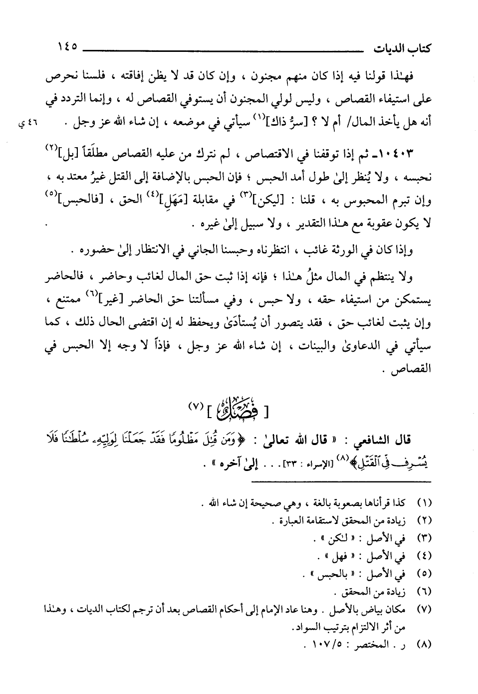 (7) مكان بياض بالأصل. وهنا عاد الإمام إلى أحكام القصاص بعد أن ترجم لكتاب الديات، وهذا من أثر الالتزام بترتيب السواد.