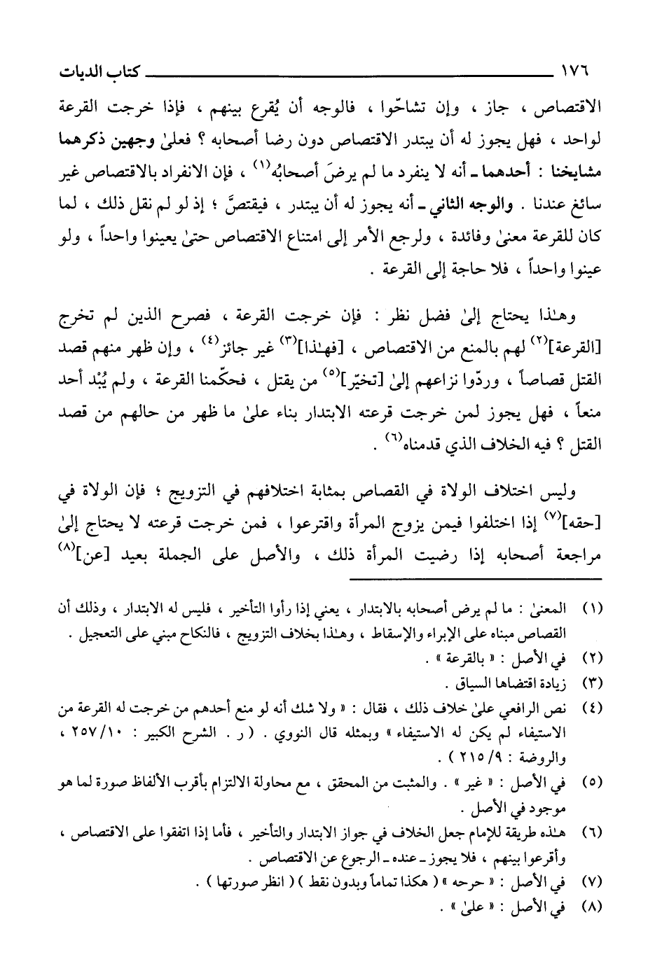 (4) نص الرافعي على خلاف ذلك، فقال: "ولا شك أنه لو منع أحدهم من خرجت له القرعة من الاستيفاء لم يكن له الاستيفاء" وبمثله قال النووي. (ر. الشرح الكبير: 10/ 257، والروضة: 9/ 215).