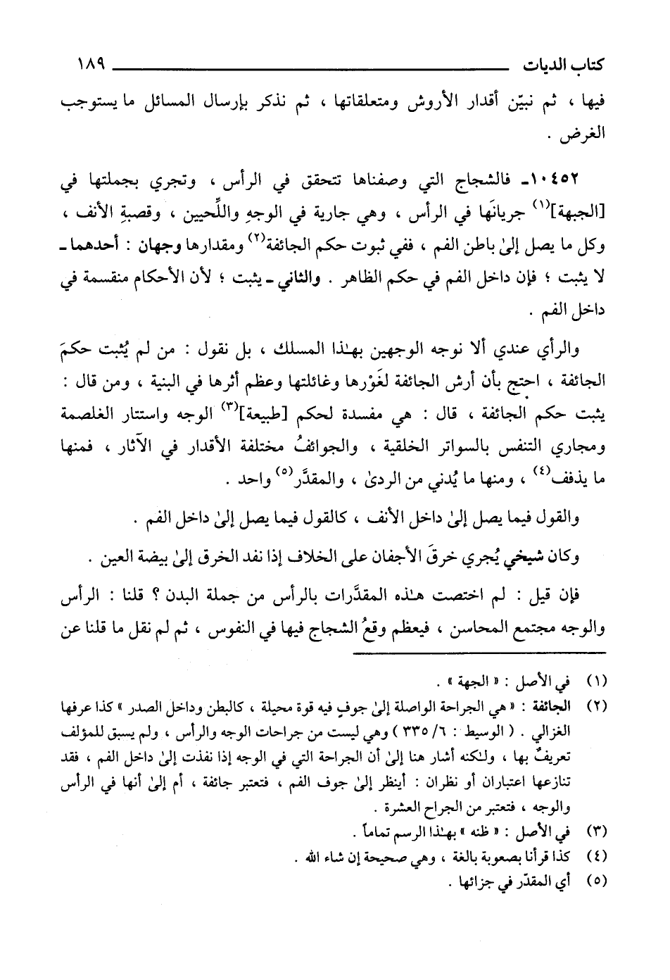 (2) الجائفة: "هي الجراحة الواصلة إلى جوفٍ فيه قوة محيلة، كالبطن وداخل الصدر" كذا عرفها الغزالي. (الوسيط: 6/ 335) وهي ليست من جراحات الوجه والرأس، ولم يسبق للمؤلف تعريفٌ بها، ولكنه أشار هنا إلى أن الجراحة التي في الوجه إذا نفذت إلى داخل الفم، فقد تنازعها اعتباران أو نظران: أينظر إلى جوف الفم، فتعتبر جائفة، أم إلى أنها في الرأس والوجه، فتعتبر من الجراح العشرة.