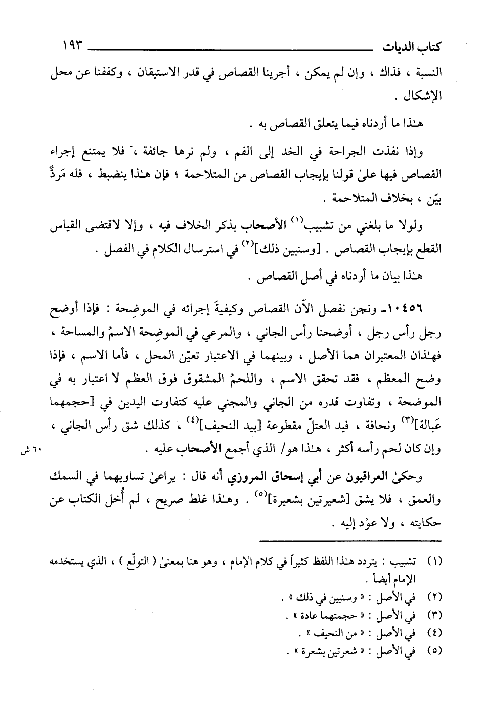 10456 - ونحن نفصل الآن القصاص وكيفيةَ إجرائه في الموضِحة: فإذا أوضح رجل رأس رجل، أوضحنا رأس الجاني، والمرعي في الموضِحة الاسمُ والمساحة، فهذان المعتبران هما الأصل، وبينهما في الاعتبار تعيّن المحل، فأما الاسم، فإذا وضح المعظم، فقد تحقق الاسم، واللحمُ المشقوق فوق العظم لا اعتبار به في الموضحة، وتفاوت قدره من الجاني والمجني عليه كتفاوت اليدين في [حجمهما عَبالة] (3) ونحافة، فيد العتلّ مقطوعة [بيد النحيف] (4)، كذلك شق رأس الجاني، وإن كان لحم رأسه أكثر، هذا هو الذي أجمع الأصحاب عليه.