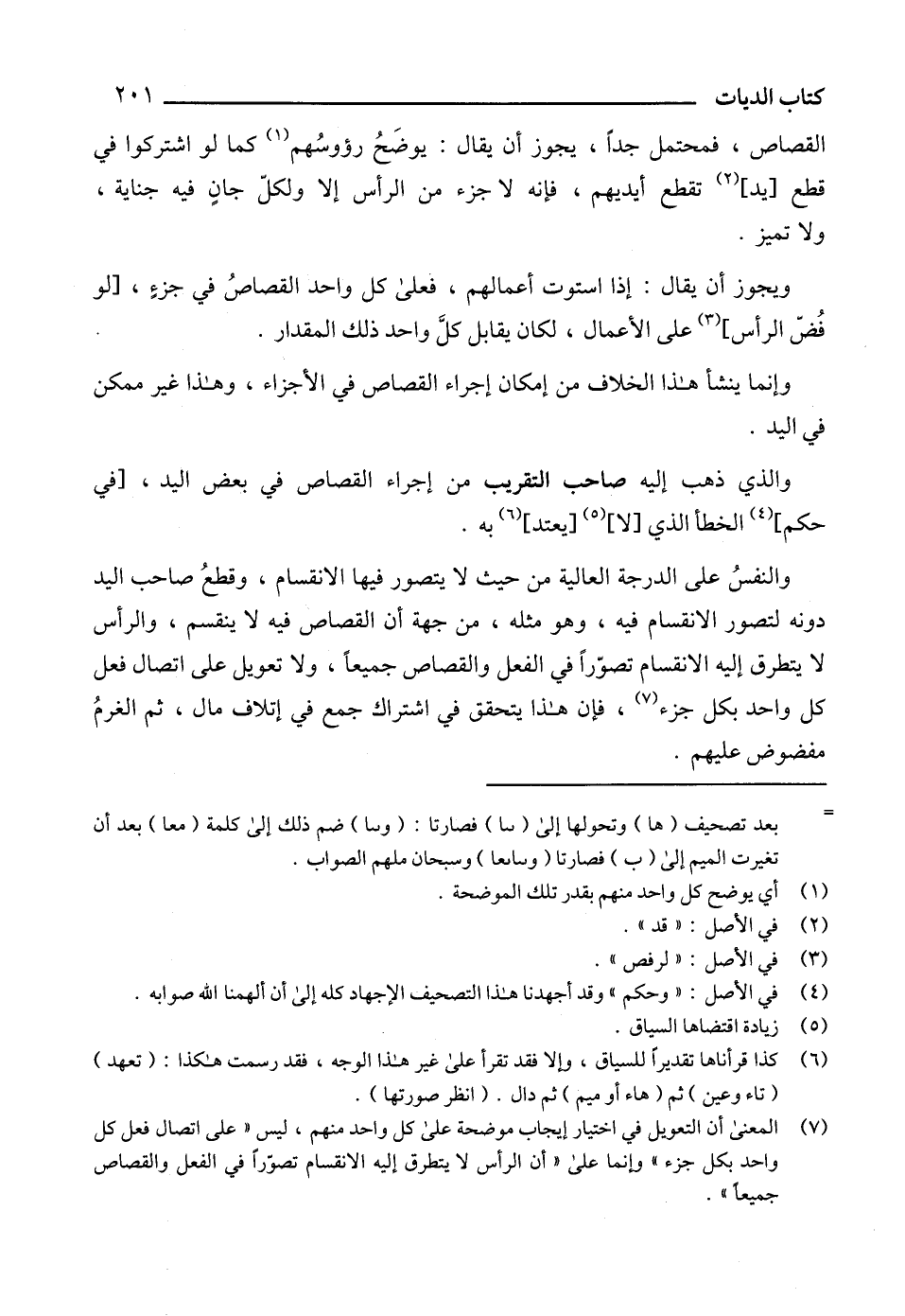 (7) المعنى أن التعويل في اختيار إيجاب موضحة على كل واحد منهم، ليس "على اتصال فعل كل واحد بكل جزء" وإنما على "أن الرأس لا يتطرق إليه الانقسام تصوّراً في الفعل والقصاص جميعاً".