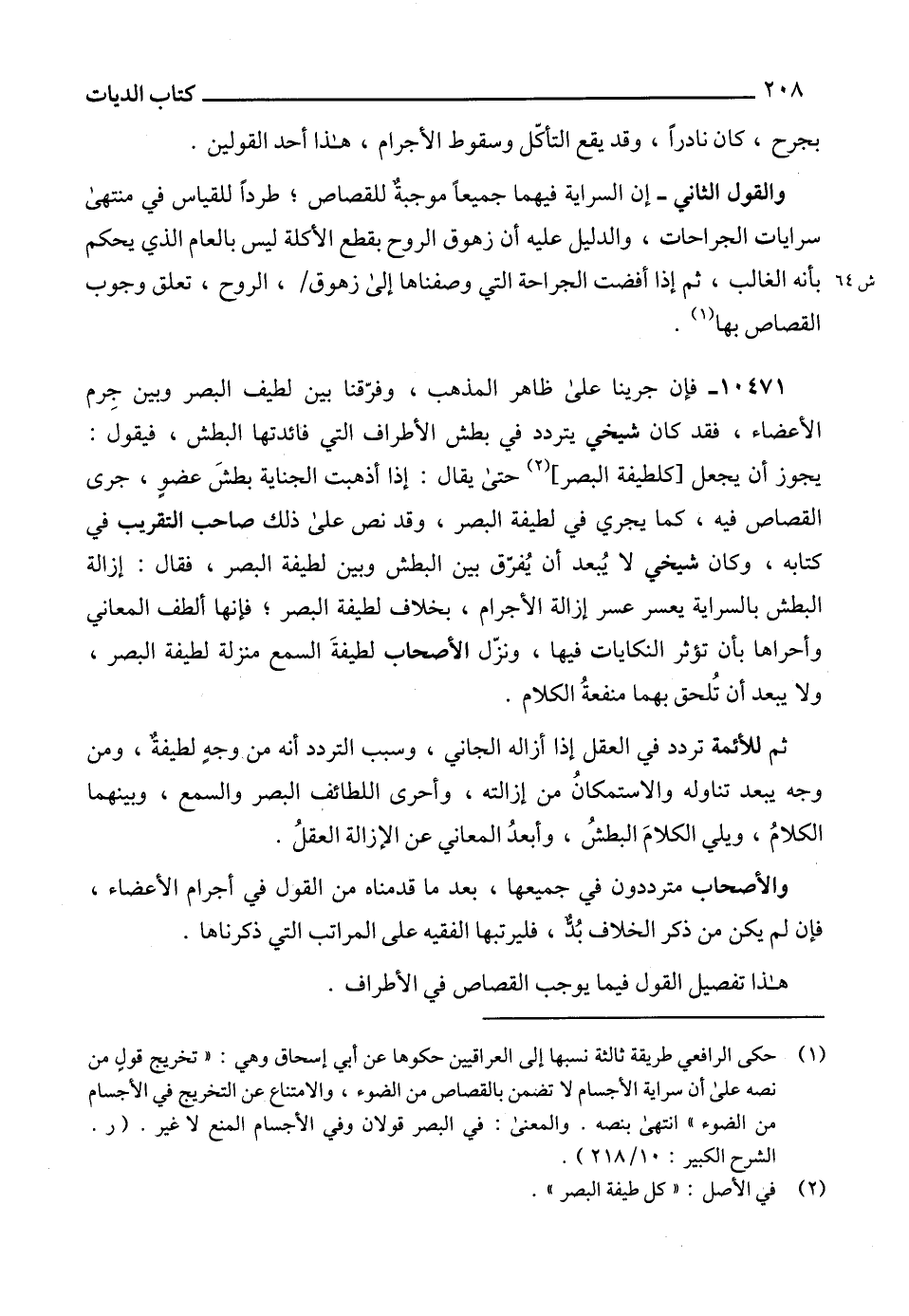 (1) حكى الرافعي طريقة ثالثة نسبها إلى العراقيين حكوها عن أبي إسحاق وهي: "تخريج قولٍ من نصه على أن سراية الأجسام لا تضمن بالقصاص من الضوء، والامتناع عن التخريج في الأجسام من الضوء" انتهى بنصه. والمعنى: في البصر قولان وفي الأجسام المنع لا غير. (ر. الشرح الكبير: 10/ 218).