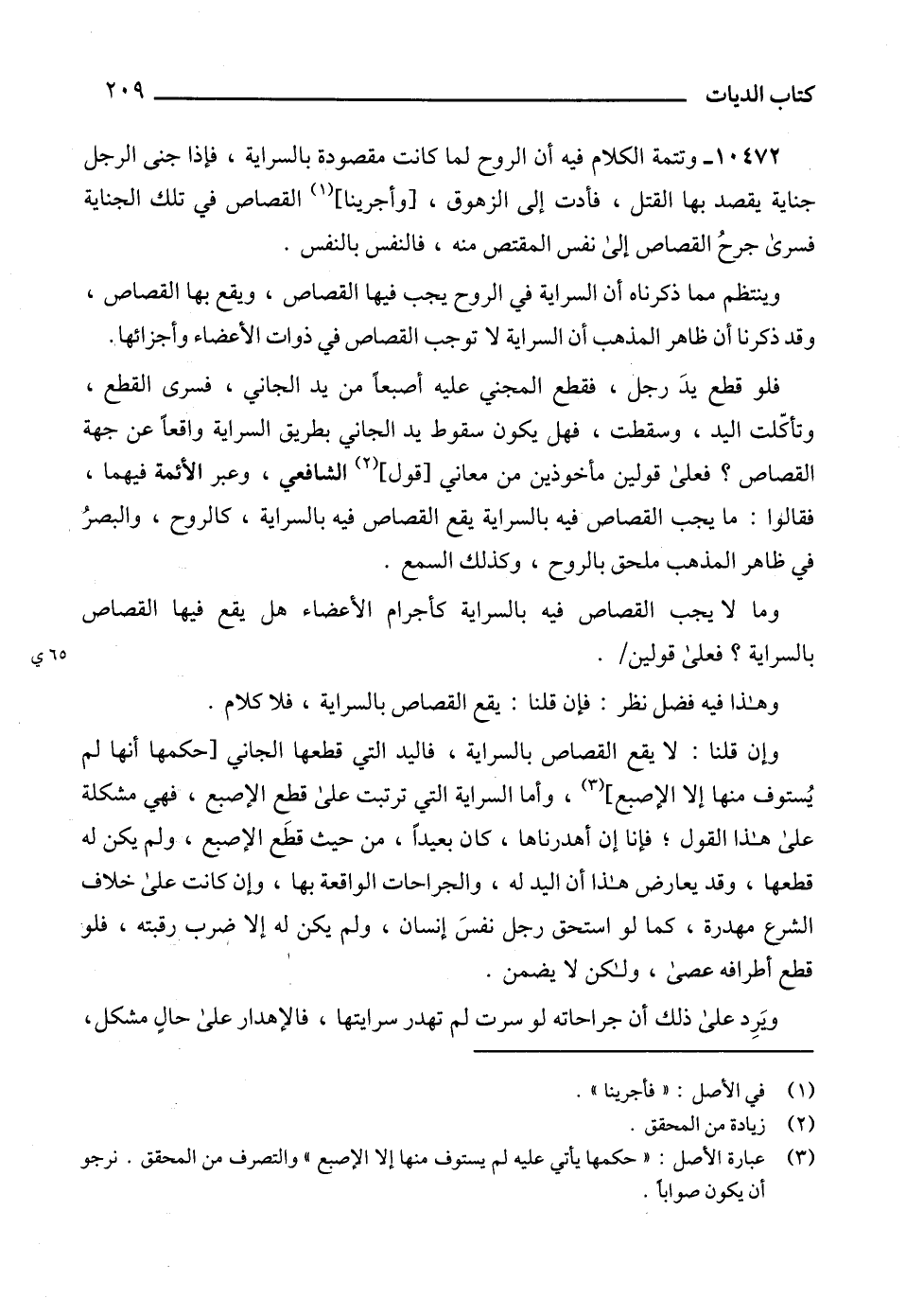 (3) عبارة الأصل: "حكمها يأتي عليه لم يستوف منها إلا الإصبع" والتصرف من المحقق. نرجو أن يكون صواباً.