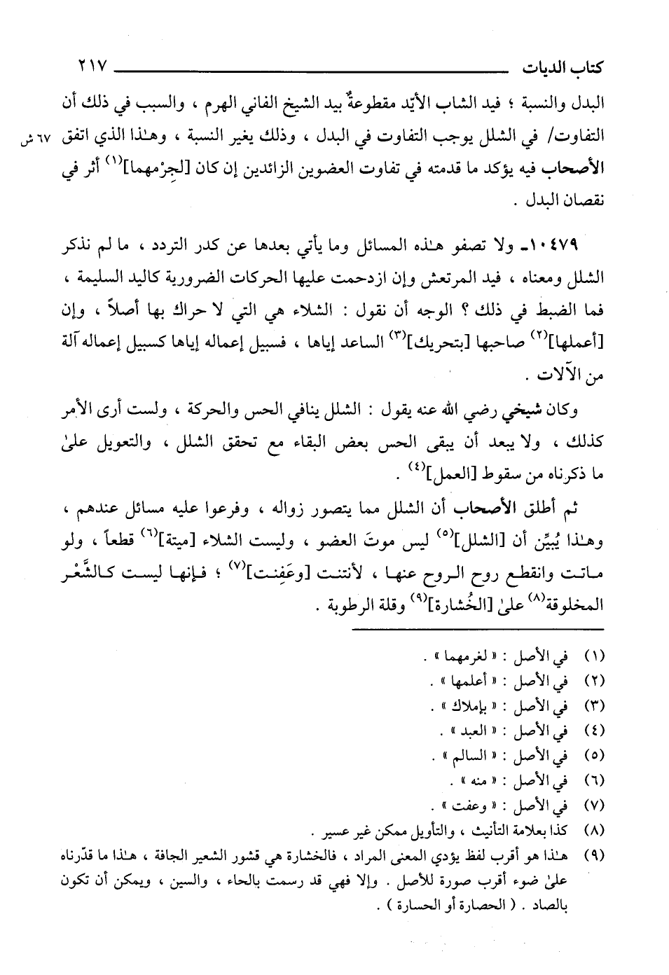 10479 - ولا تصفو هذه المسائل وما يأتي بعدها عن كدر التردد، ما لم نذكر الشلل ومعناه، فيد المرتعش وإن ازدحمت عليها الحركات الضرورية كاليد السليمة، فما الضبط في ذلك؟ الوجه أن نقول: الشلاء هي التي لا حراك بها أصلاً، وإن [أعملها] (2) صاحبها [بتحريك] (3) الساعد إياها، فسبيل إعماله إياها كسبيل إعماله آلة من الآلات.