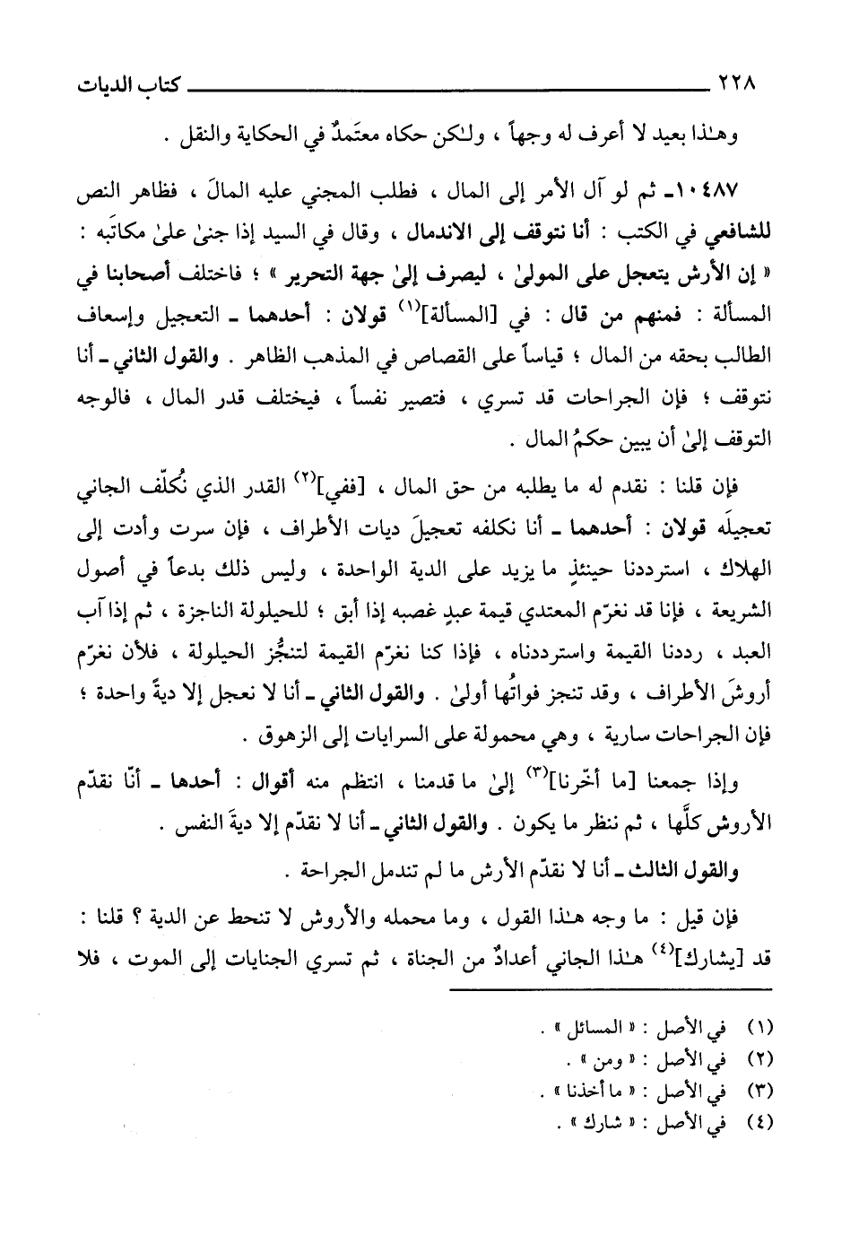 وإذا جمعنا [ما أخّرنا] (3) إلى ما قدمنا، انتظم منه أقوال: أحدها - أنّا نقدّم الأروشى كلَّها، ثم ننظر ما يكون. والقول الثاني - أنا لا نقدّم إلا ديةَ النفس.