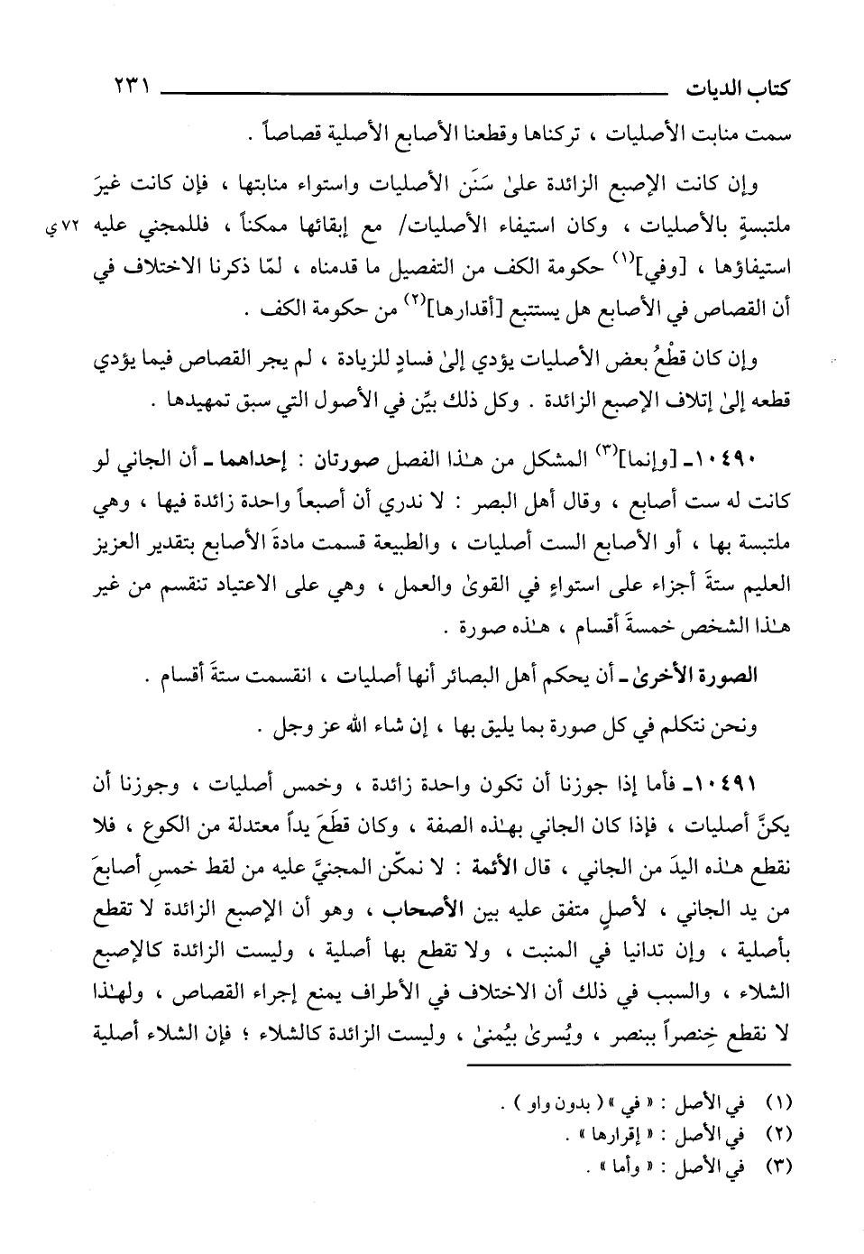 10490 - [وإنما] (3) المشكل من هذا الفصل صورتان: إحداهما - أن الجاني لو كانت له ست أصابع، وقال أهل البصر: لا ندري أن أصبعاً واحدة زائدة فيها، وهي ملتبسة بها، أو الأصابع الست أصليات، والطبيعة قسمت مادةَ الأصابع بتقدير العزيز العليم ستةَ أجزاء على استواءٍ في القوى والعمل، وهي على الاعتياد تنقسم من غير هذا الشخص خمسةَ أقسام، هذه صورة.