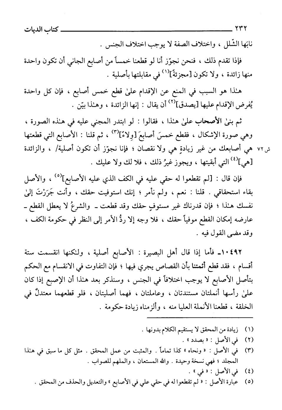 10492 - فأما إذا قال أهل البصيرة: الأصابع أصلية، ولكنها انقسمت ستة أقسام، فقد قطع أئمتنا بأن القصاص يجري فيها؛ فإن التفاوت في الانقسام مع الحكم بتأصل الأصابع لا يوجب اختلافاً في الجنس، وسنذكر بعد هذا أن الإصبع إذا كان على رأسها أنملتان مستندتان، وعاملتان، فهما أصليتان، فلو قطعهما معتدلٌ في الخلقة، قطعنا الأنملة العليا منه، وألزمناه زيادة حكومة.