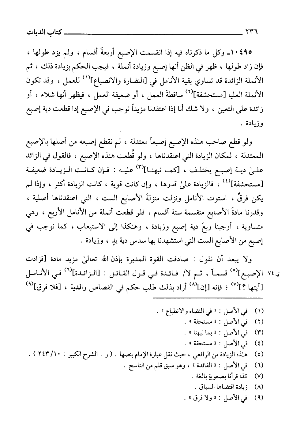 ولا يبعد أن نقول: صادفت القوة المدبرة بإذن الله تعالى مزيد مادة [فزادت الإصبع] (5) قسماً، ثم لا فائدة في قول القائل: [الزائدة] (6) في الأنامل [أيتها؟] (7)؛ فإنه [إن] (8) أراد بذلك طلب حكم في القصاص والدية، [فلا فرق] (9)
