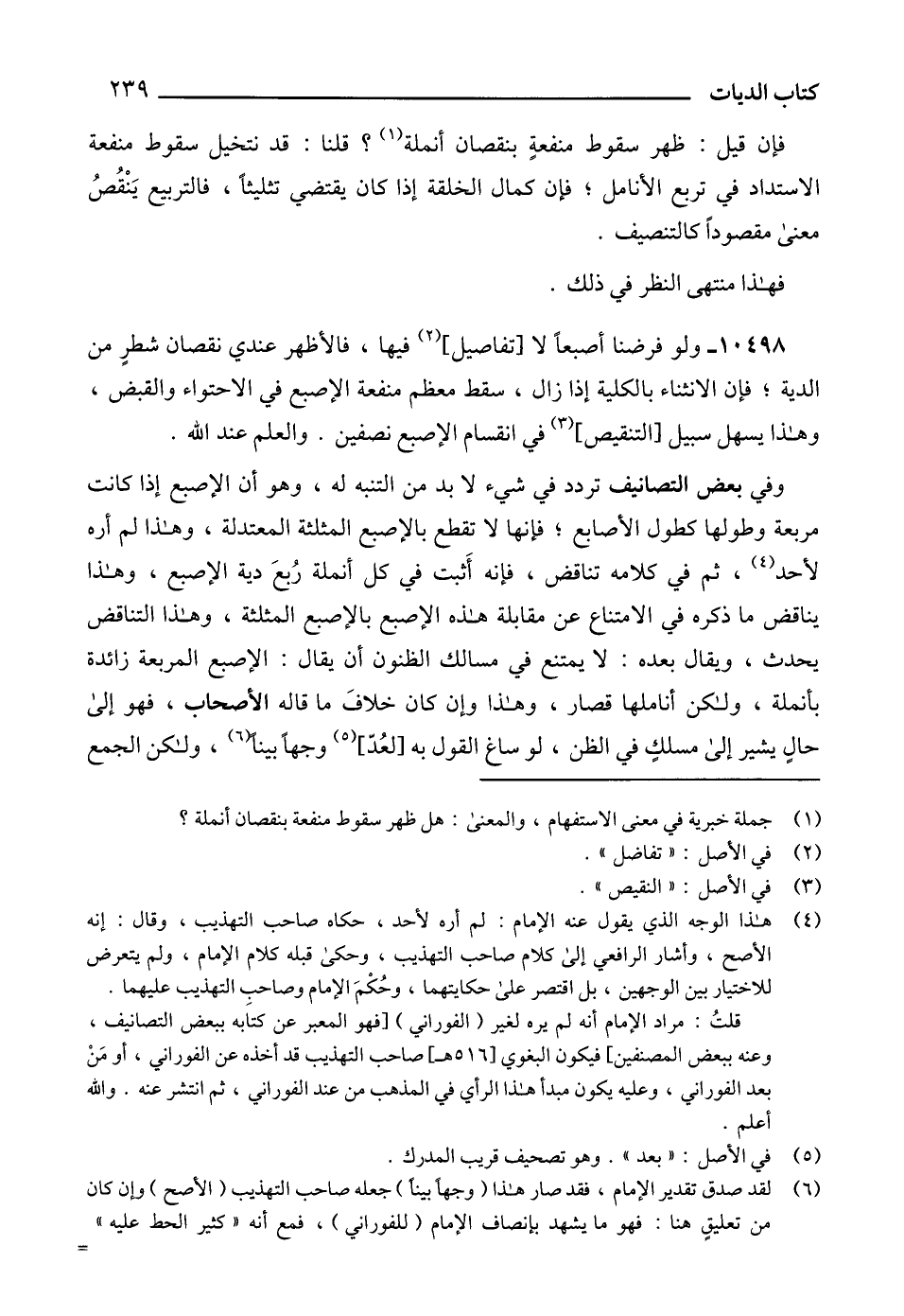 10498 - ولو فرضنا أصبعاً لا [تفاصيل] (2) فيها، فالأظهر عندي نقصان شطرٍ من الدية؛ فإن الانثناء بالكلية إذا زال، سقط معظم منفعة الإصبع في الاحتواء والقبض، وهذا يسهل سبيل [التنقيص] (3) في انقسام الإصبع نصفين. والعلم عند الله.