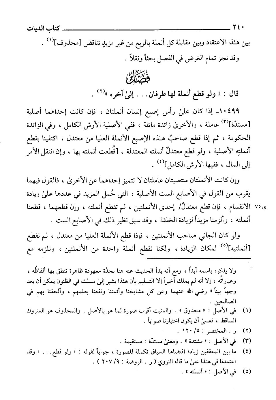 10499 - إذا كان على رأس إصبع إنسان أنملتان، فإن كانت إحداهما أصلية [مستدّة] (3) عاملة، والأخرى زائدة مائلة، ففي الأصلية الأرش الكامل، وفي الزائدة الحكومة، ثم إذا قطع صاحبُ هذه الإصبع الأنملة العليا من معتدل، اكتفينا بقطع أنملتِه الأصلية، ولو قطع معتدلٌ أنملته المعتدلة، [قُطعت أنملته بها، وإن انتقل الأمر إلى المال، ففيها الأرش الكامل] (4).