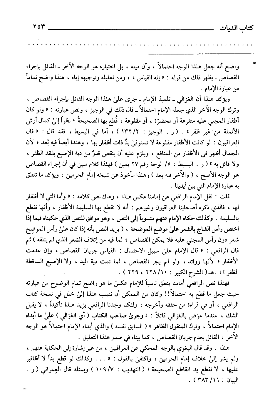 فهذا نص الرافعي أمامنا ينطق ناسباً للإمام عكسَ ما هو واضح تمام الوضوح من عبارته حيث جعل ما قطع به احتمالاً!! وكان من الممكن أن ننسب هذا إلى خلل في نسخة كتاب الرافعي، أو في قراءة من حققه وأخرجه، ولكنا وجدنا الرافعي يزيد هذا تأكيداً، لا يقبل الشك، عندما عرّض بالغزالي قائلاً: "وجرى صاحب الكتاب (أي الغزالي) على ما أبداه الإمام احتمالاً، وترك المنقول الظاهر" (السابق نفسه) والذي أبداه الإمام احتمالاً هو الوجه الآخر، القائل بعدم جريان القصاص، كما بيناه في صدر هذا التعليق.