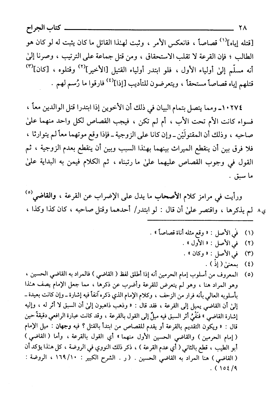 (5) المعروف من أسلوب إمام الحرمين أنه إذا أطلق لفظ (القاضي) فالمراد به القاضي الحسين، وهو المراد هنا، وهو لم يتعرض للقرعة وأضرب عن ذكرها، مما جعل الإمام يصف هذا بأسلوبه العالي بأنه فرار من الزحف، وكلام الإمام الذي ذكره آنفاًَ فيه إشارة -وإن كانت بعيدة- إلى أن القاضي يميل إلى القرعة، فقد قال: "وذهب ذاهبون إلى أن السبق لا أثر له، وإليه إشارة القاضي" فنَفْيُ أثر السبق فيه ميلٌ إلى القول بالقرعة، وقد كانت عبارة الرافعي دقيقةً حين قال: "ويكون التقديم بالقرعة أو يقدم للقصاص من ابتدأ بالقتل؟ فيه وجهان: ميل الإمام (إمام الحرمين) والقاضي الحسين الأول منهما" أي القول بالقرعة، وأما (القاضي) أبو الطيب، قطع بالثاني (أي عدم القرعة)، ذكر ذلك النووي في الروضة، كل هذا يؤكد أن (القاضي) هنا المراد به القاضي الحسين. (ر. الشرح الكبير: 10/ 169، الروضة: 9/ 154).