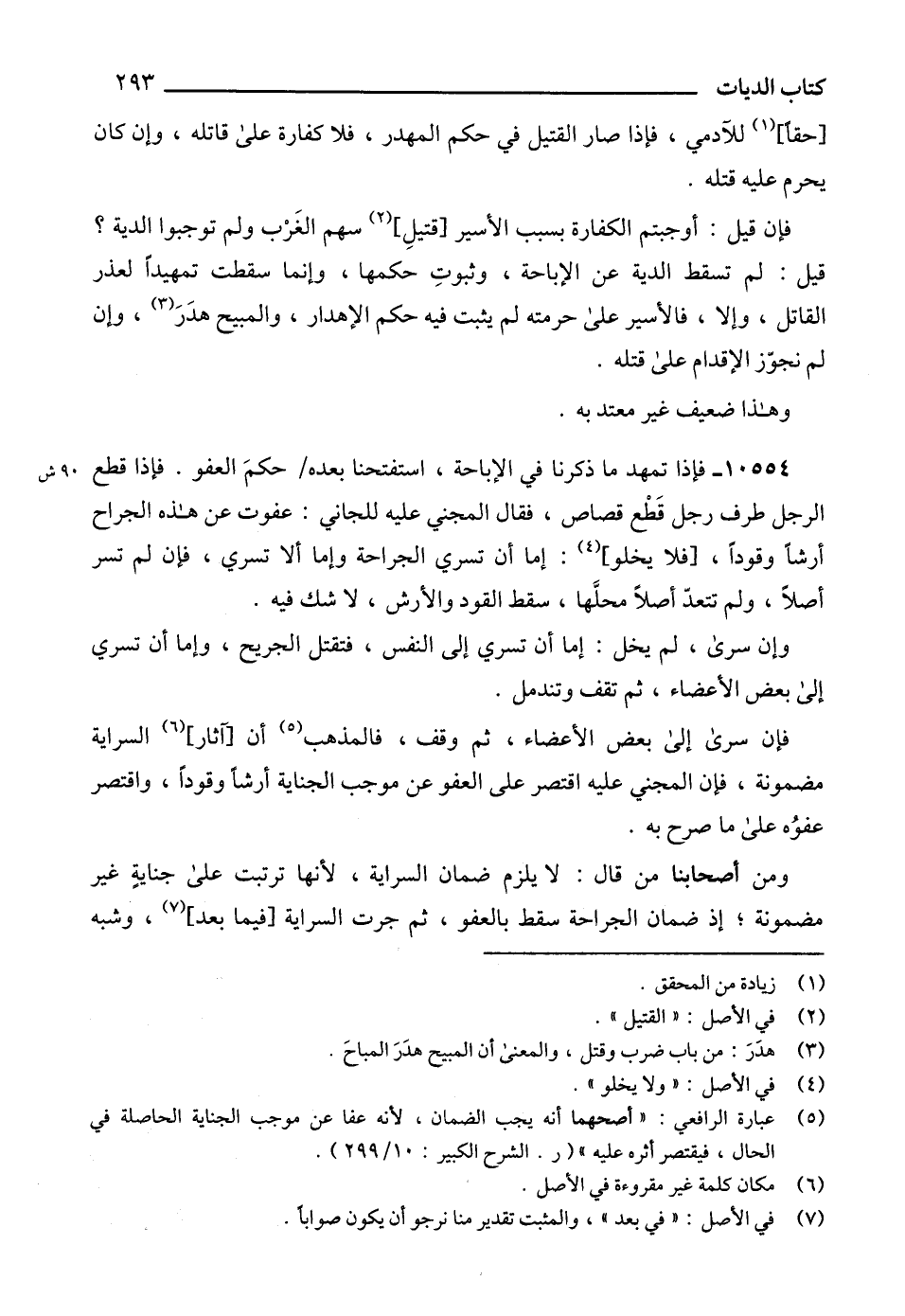 (5) عبارة الرافعي: "أصحهما أنه يجب الضمان، لأنه عفا عن موجب الجناية الحاصلة في الحال، فيقتصر أثره عليه" (ر. الشرح الكبير: 10/ 299).