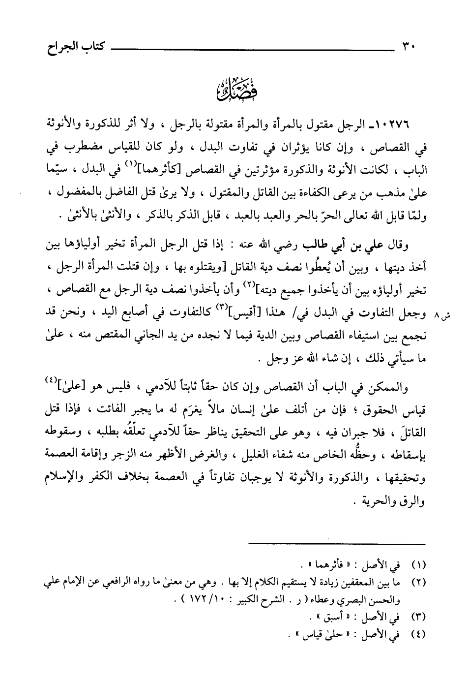 10276 - الرجل مقتول بالمرأة والمرأة مقتولة بالرجل، ولا أثر للذكورة والأنوثة في القصاص، وإن كانا يؤثران في تفاوت البدل، ولو كان للقياس مضطرب في الباب، لكانت الأنوثة والذكورة مؤثرتين في القصاص [كأئرهما] (1) في البدل، سيّما على مذهب من يرعى الكفاءة بين القاتل والمقتول، ولا يرى قتل الفاضل بالمفضول، ولمّا قابل الله تعالى الحرّ بالحر والعبد بالعبد، قابل الذكر بالذكر، والأنثى بالأنثى.