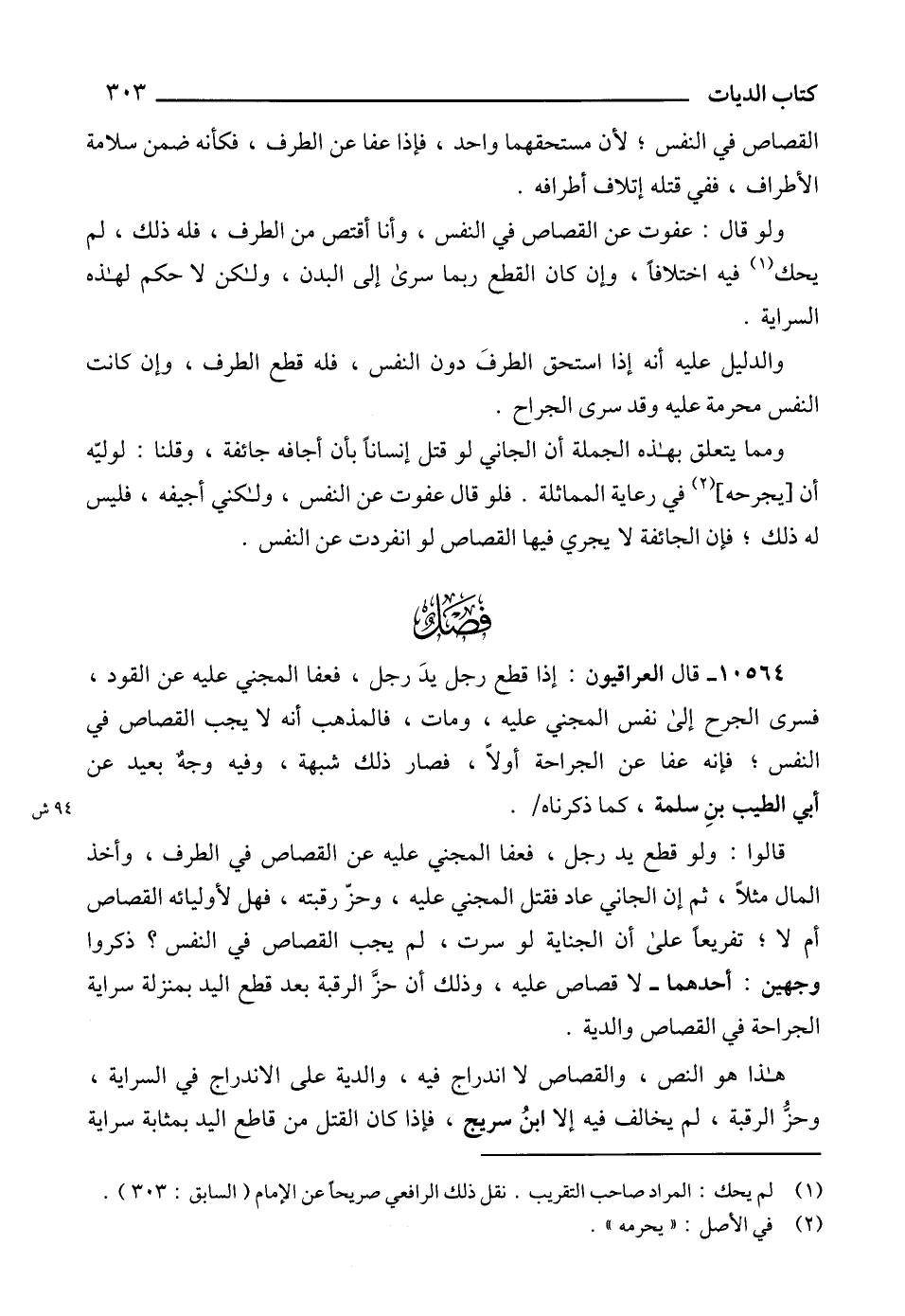10564 - قال العراقيون: إذا قطع رجل يدَ رجل، فعفا المجني عليه عن القود، فسرى الجرح إلى نفس المجني عليه، ومات، فالمذهب أنه لا يجب القصاص في النفس؛ فإنه عفا عن الجراحة أولاً، فصار ذلك شبهة، وفيه وجهٌ بعيد عن أبي الطيب بنِ سلمة، كما ذكرناه.
