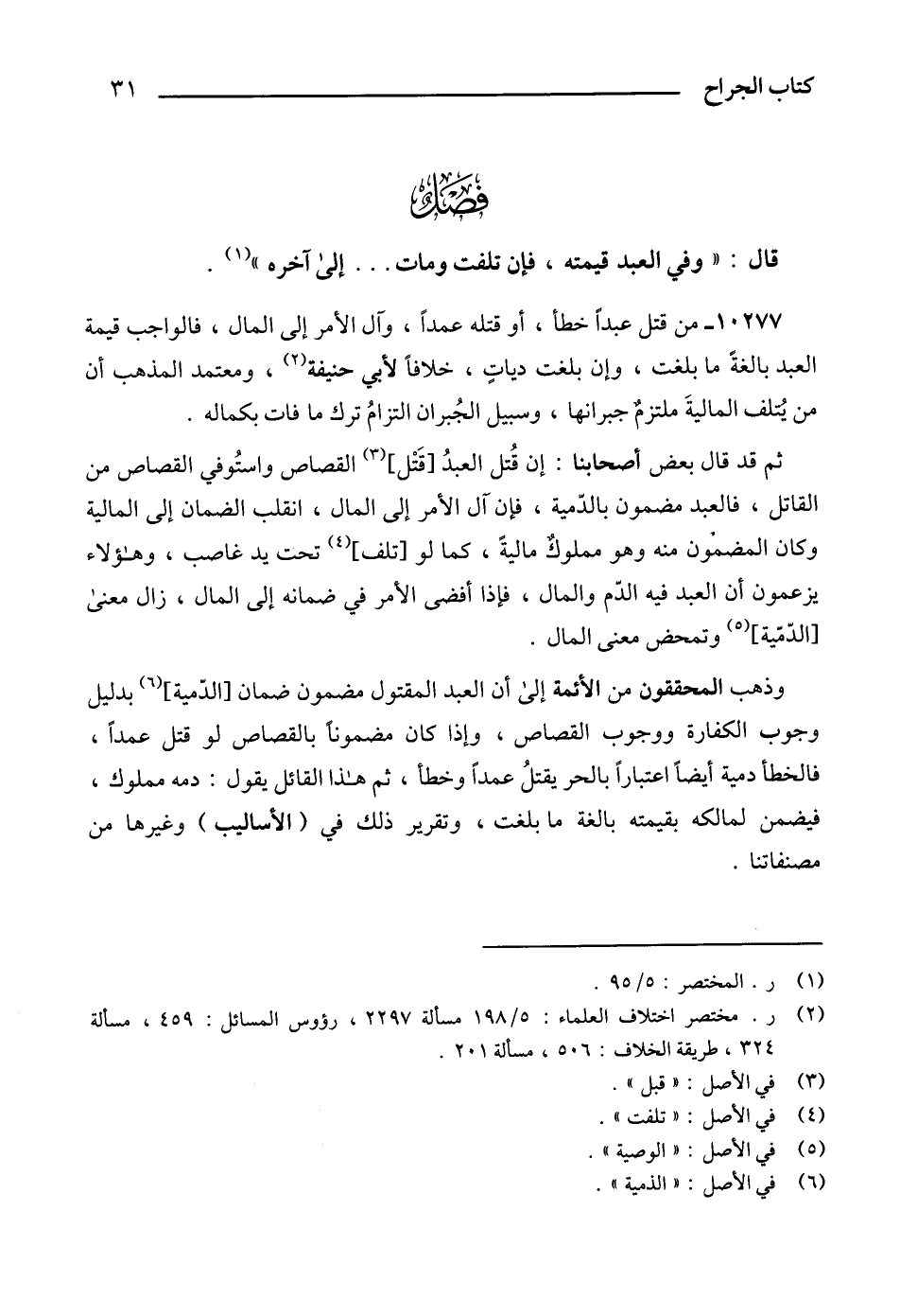 10277 - من قتل عبداً خطأ، أو قتله عمداً، وآل الأمر إلى المال، فالواجب قيمة العبد بالغةً ما بلغت، وإن بلغت دياتٍ، خلافاً لأبي حنيفة (2)، ومعتمد المذهب أن من يُتلف الماليةَ ملتزمٌ جبرانها، وسبيل الجُبران التزامُ ترك ما فات بكماله.