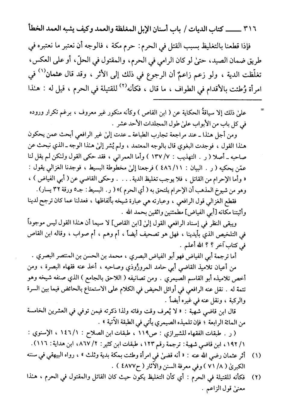 ومن أجل هذا -عند مراجعة تجارب الطباعة- عدت إلى غير الرافعي أبحث عمن يحكون هذا القول، فوجدت البغوي قال بالوجه المعتمد، ولم يُشر إلى هذا الوجه -الذي نبحث عن صاحبه- أصلا (ر. التهذيب: 7/ 137) وأما العمراني، فقد حكى القول ولكن لم يقل لنا عمّن يحكيه (ر. البيان: 11/ 486) فرجعنا إلى مخطوطة البسيط، فوجدنا الغزالي يقول: " وأما الإحرام من القاتل، فلا يوجب تغليظ الدية .... وحكى القاضي عن (أبي الفياض)، وهو من شيوخ المذهب أن الإحرام يلتحق به (أي الحرم) " (ر. البسيط: جـ 5 ورقة 32 يسار).