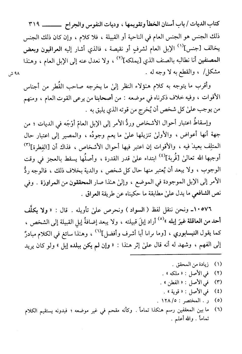 10576 - ونحن ننقل لفظ (السواد) ونحرص على تأويله. قال: "ولا يكلَّف أحد من العاقلة غيرَ إبله" (5) أراد إبلَ قبيلته، ولا يبعد إضافةُ إبلِ القبيلة إلى الشخص، كما يقول النيسابوري، [وما ـرا ـا أبا أشرف وأفضل] (6)، وهذا سائغ في الكلام مبادرٌ إلى الفهم، وشهد له أنه قال على إثر هذا: "وإن لم يكن ببلده إبل" ولو كان يريد