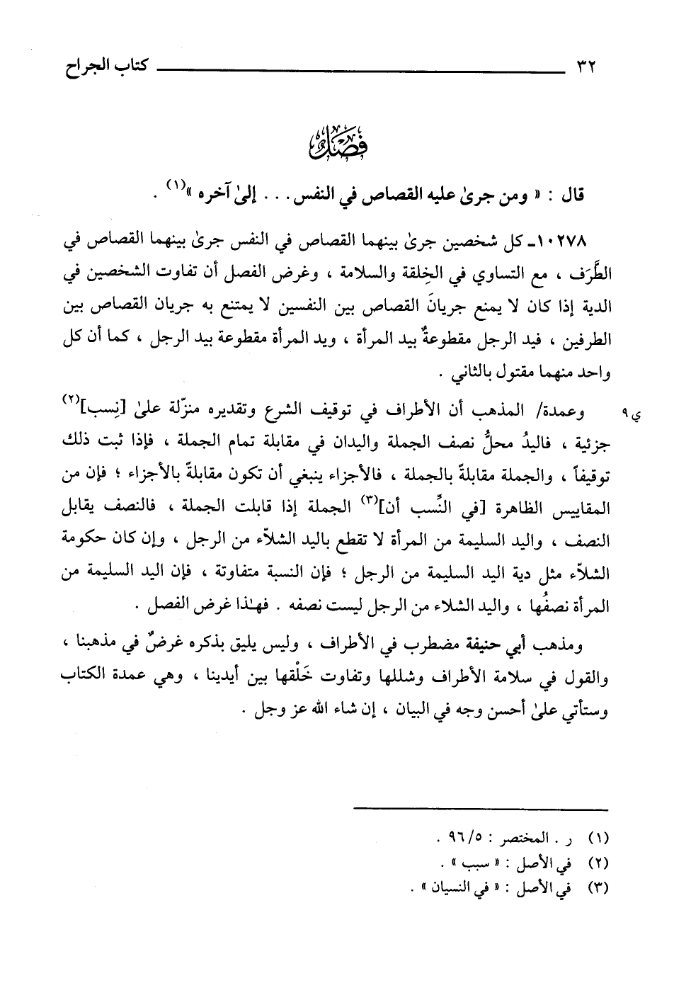 10278 - كل شخصين جرى بينهما القصاص في النفس جرى بينهما القصاص في الطَّرَف، مع التساوي في الخِلقة والسلامة، وغرض الفصل أن تفاوت الشخصين في الدية إذا كان لا يمنع جريانَ القصاص بين النفسين لا يمتنع به جريان القصاص بين الطرفين، فيد الرجل مقطوعةٌ بيد المرأة، ويد المرأة مقطوعة بيد الرجل، كما أن كل واحد منهما مقتول بالثاني.