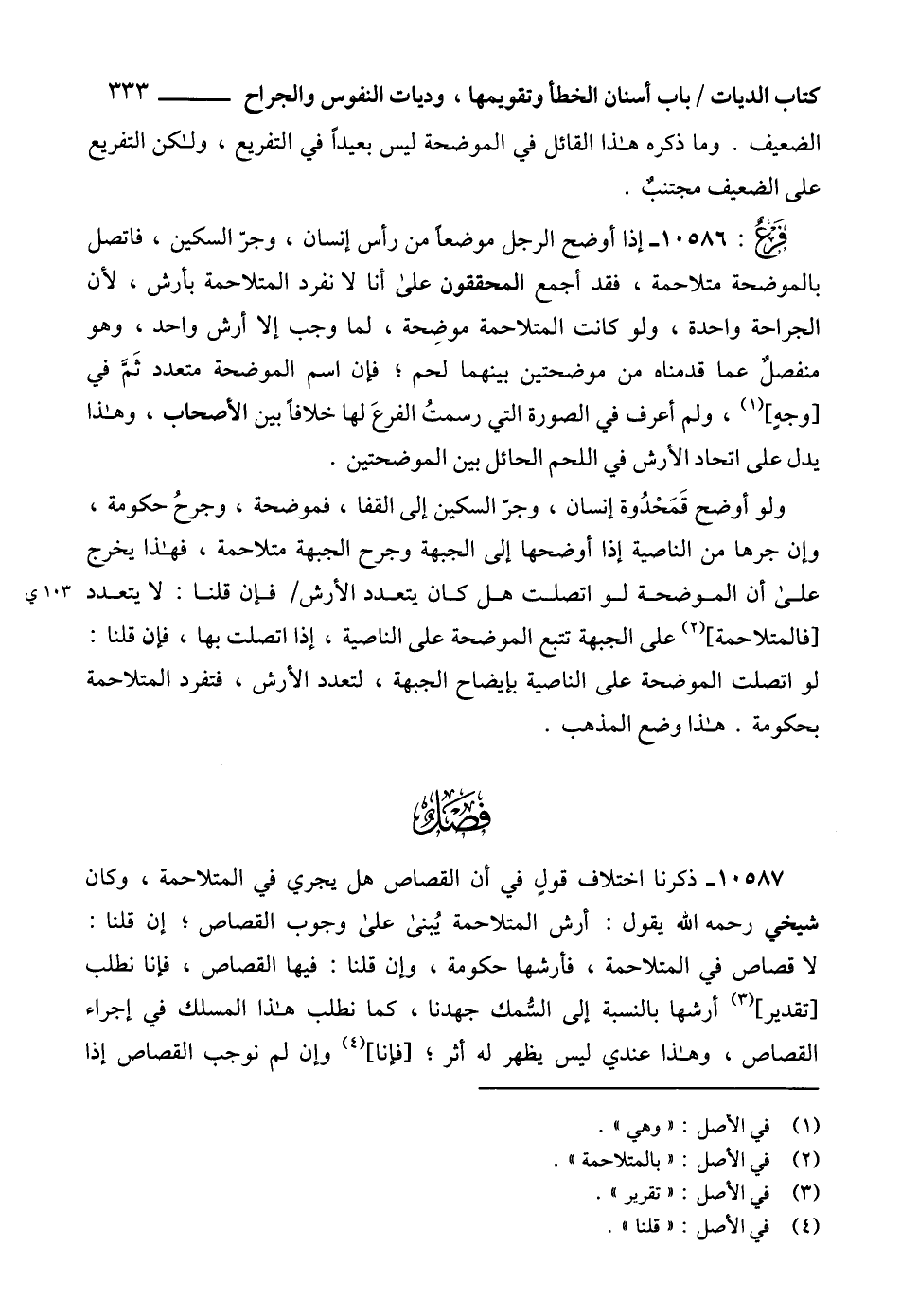 10587 - ذكرنا اختلاف قولٍ في أن القصاص هل يجري في المتلاحمة، وكان شيخي رحمه الله يقول: أرش المتلاحمة يُبنى على وجوب القصاص؛ إن قلنا: لا قصاص في المتلاحمة، فأرشها حكومة، وإن قلنا: فيها القصاص، فإنا نطلب [تقدير] (3) أرشها بالنسبة إلى السُّمك جهدنا، كما نطلب هذا المسلك في إجراء القصاص، وهذا عندي ليس يظهر له أثر؛ [فإنا] (4) وإن لم نوجب القصاص إذا