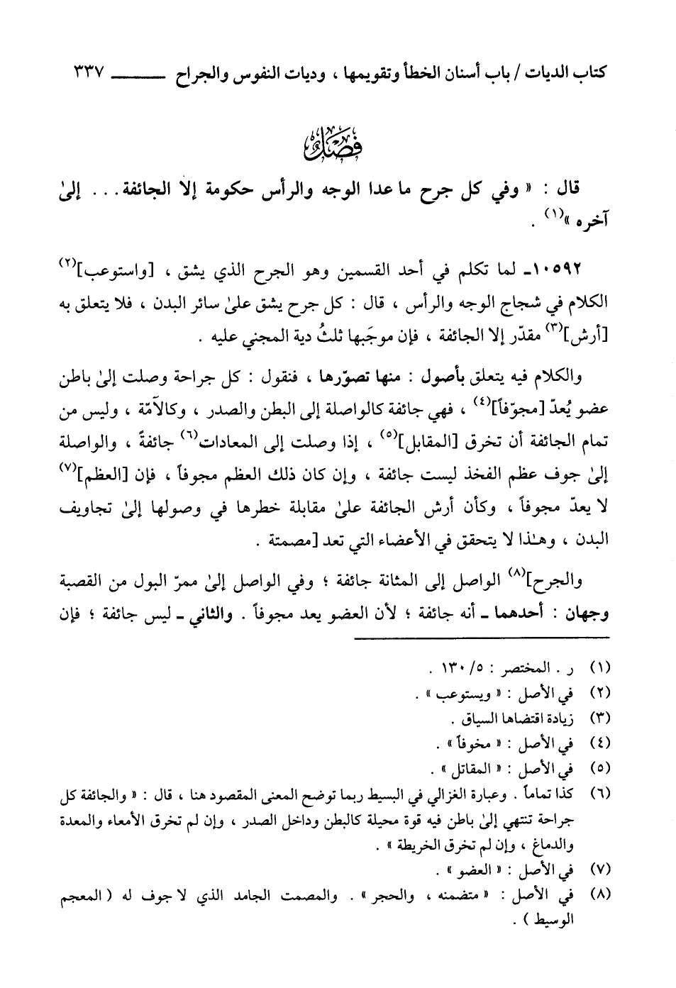 (6) كذا تماماً. وعبارة الغزالي في البسيط ربما توضح المعنى المقصود هنا، قال: "والجائفة كل جراحة تنتهي إلى باطن فيه قوة محيلة كالبطن وداخل الصدر، وإن لم تخرق الأمعاء والمعدة والدماغ، وإن لم تخرق الخريطة".