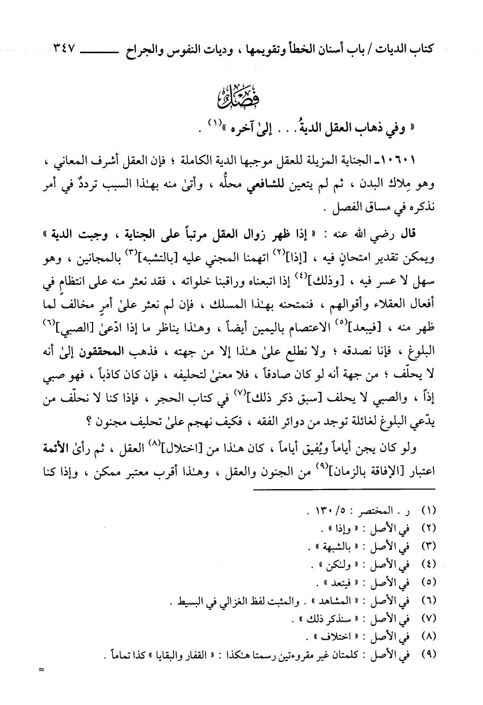 10601 - الجناية المزيلة للعقل موجبها الدية الكاملة؛ فإن العقل أشرف المعاني، وهو مِلاك البدن، ثم لم يتعين للشافعي محلُّه، وأتى منه بهذا السبب ترددٌ في أمر نذكره في مساق الفصل.