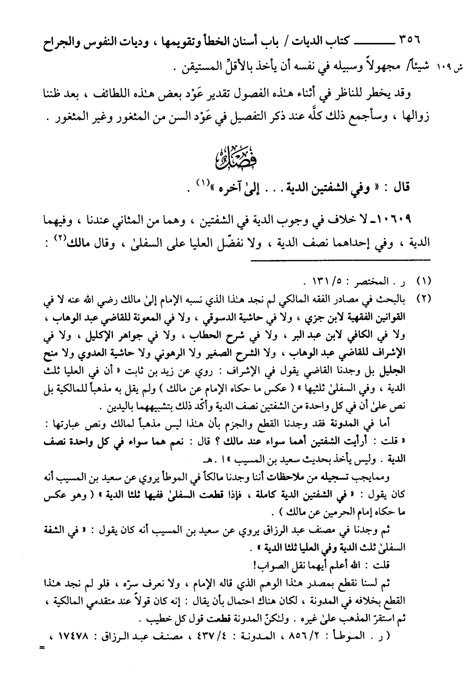 (2) بالبحث في مصادر الفقه المالكي لم نجد هذا الذي نسبه الإمام إلى مالك رضي الله عنه لا في القوانين الفقهية لابن جزي، ولا في حاشية الدسوقي، ولا في المعونة للقاضي عبد الوهاب، ولا في الكافي لابن عبد البر، ولا في شرح الحطاب، ولا في جواهر الأكليل، ولا في الأشراف للقاضي عبد الوهاب، ولا الشرح الصغير ولا الرهوني ولا حاشية العدوي ولا منح الجليل بل وجدنا القاضي يقول في الإشراف: روي عن زيد بن ثابت لا أن في العليا ثلث الدية، وفي السفلى ثلثيها" (عكس ما حكاه الإمام عن مالك) ولم يقل به مذهباً للمالكية بل نص على أن في كل واحدة من الشفتين نصف الدية وأكّد ذلك بتشبيههما باليدين.