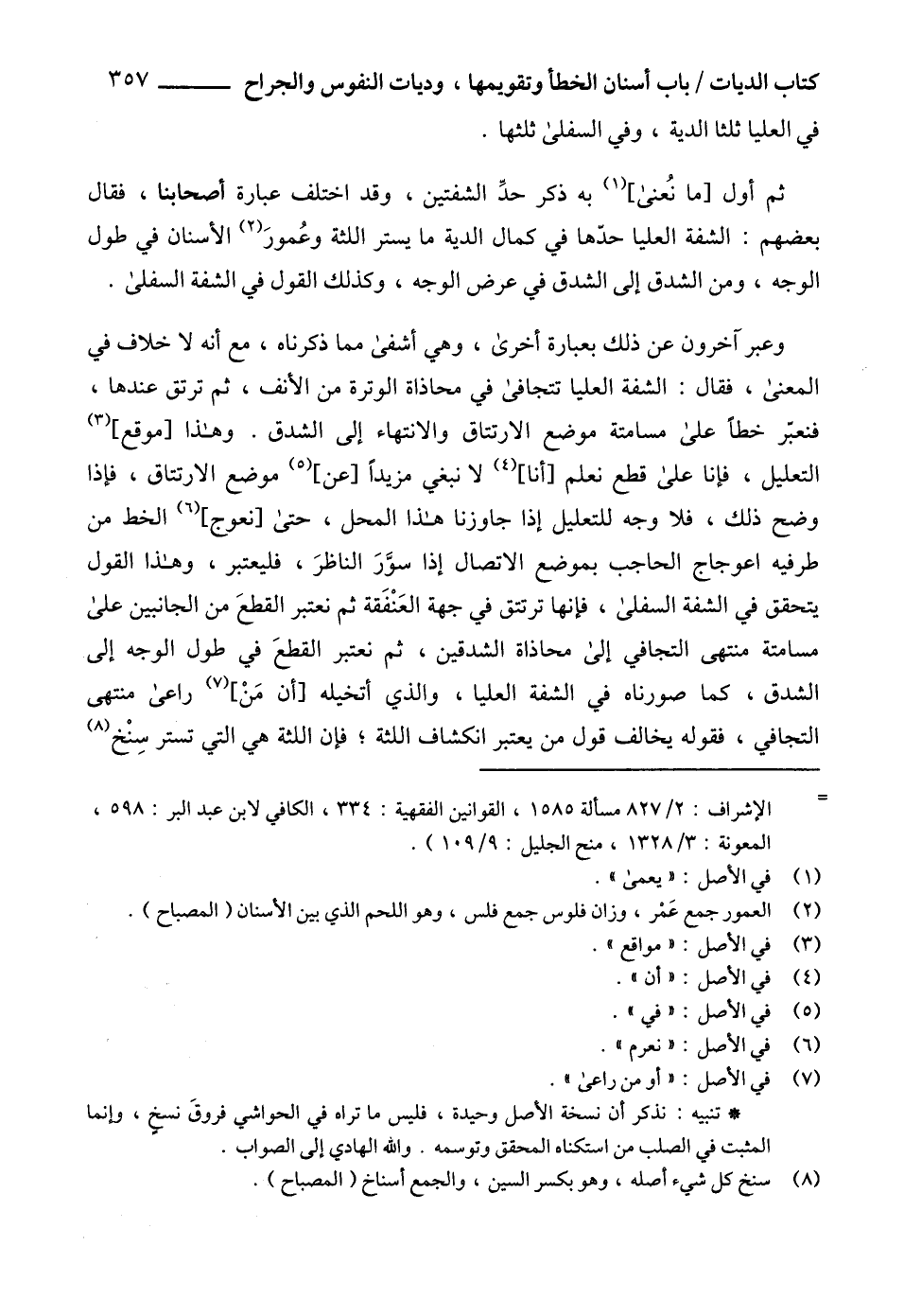 وعبر آخرون عن ذلك بعبارة أخرى، وهي أشفى مما ذكرناه، مع أنه لا خلاف في المعنى، فقال: الشفة العليا تتجافى في محاذاة الوترة من الأنف، ثم ترتق عندها، فنعبّر خطاً على مسامتة موضع الارتتاق والانتهاء إلى الشدق. وهذا [موقع] (3) التعليل، فإنا على قطع نعلم [أنا] (4) لا نبغي مزيداً [عن] (5) موضع الارتتاق، فإذا وضح ذلك، فلا وجه للتعليل إذا جاوزنا هذا المحل، حتى [نعوج] (6) الخط من طرفيه اعوجاج الحاجب بموضع الاتصال إذا سوَّرَ الناظرَ، فليعتبر، وهذا القول يتحقق في الشفة السفلى، فإنها ترتتق في جهة العَنْفَقة ثم نعتبر القطعَ من الجانبين على مسامتة منتهى التجافي إلى محاذاة الشدقين، ثم نعتبر القطعَ في طول الوجه إلى الشدق، كما صورناه في الشفة العليا، والذي أتخيله [أن مَنْ] (7) راعى منتهى التجافي، فقوله يخالف قول من يعتبر انكشاف اللثة؛ فإن اللثة هي التي تستر سِنْخ (8)