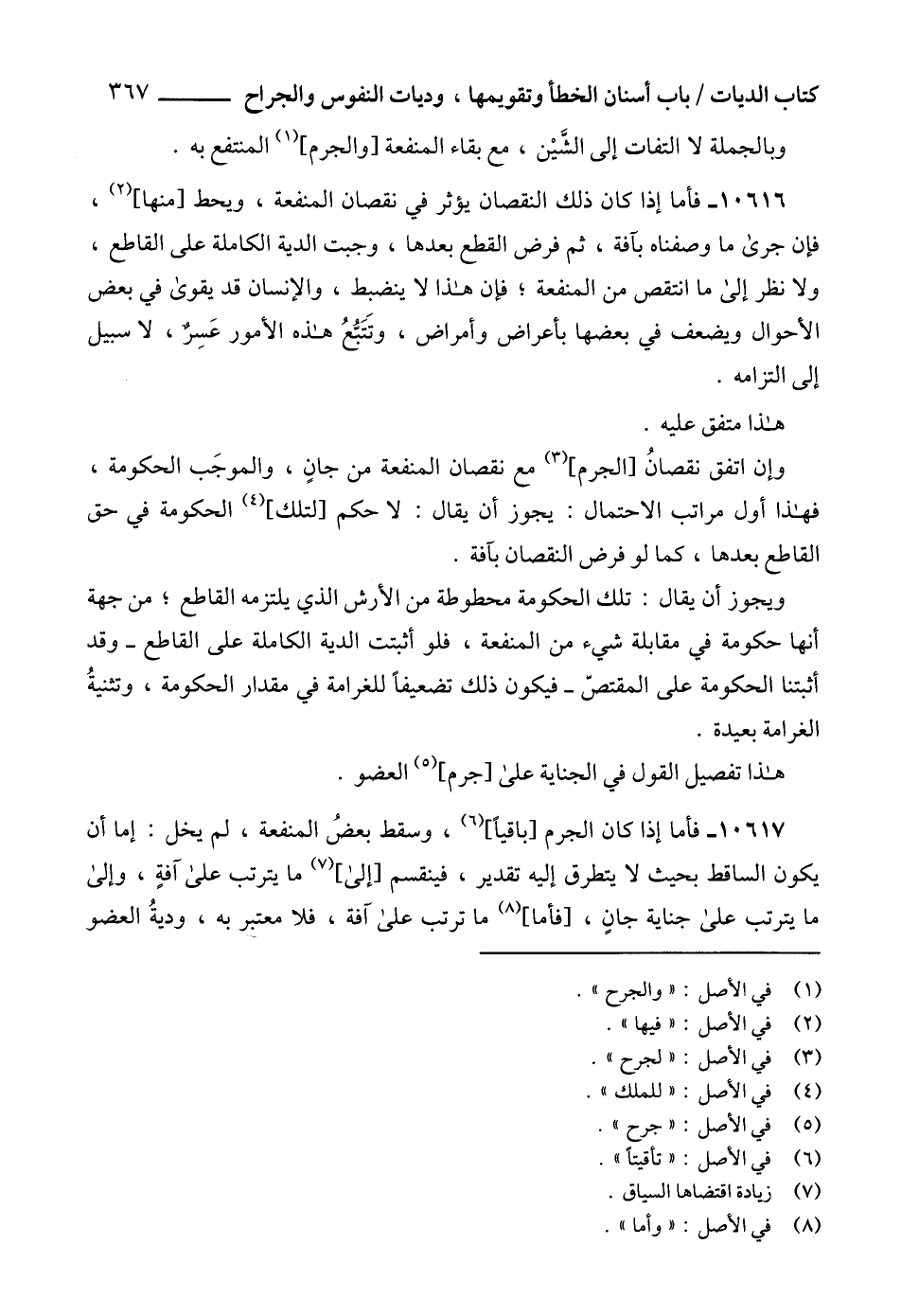 10617 - فأما إذا كان الجرم [باقياً] (6)، وسقط بعضُ المنفعة، لم يخل: إما أن يكون الساقط بحيث لا يتطرق إليه تقدير، فينقسم [إلى] (7) ما يترتب على آفةٍ، وإلى ما يترتب على جناية جانٍ، [فأما] (8) ما ترتب على آفة، فلا معتبر به، وديةُ العضو