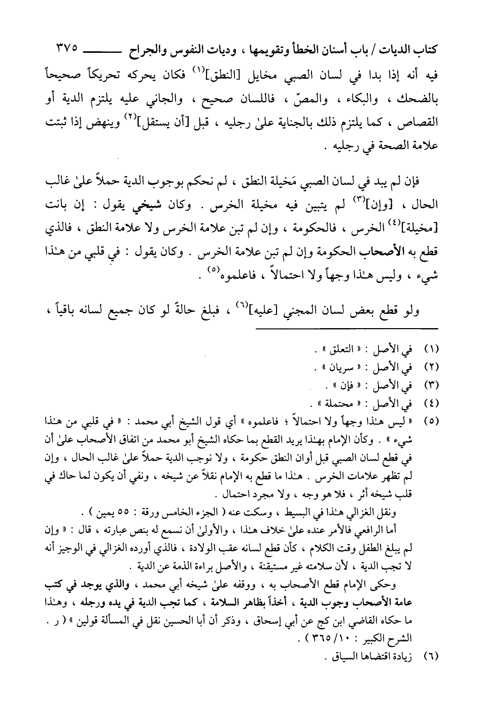 (5) " ليس هذا وجهاً ولا احتمالاً؛ فاعلموه" أي قول الشيخ أبي محمد: "في قلبي من هذا شيء". وكأن الإمام بهذا يريد القطع بما حكاه الشيخ أبو محمد من اتفاق الأصحاب على أن في قطع لسان الصبي قبل أوان النطق حكومة، ولا نوجب الدية حملاً على غالب الحال، وإن لم تظهر علامات الخرس. هذا ما قطع به الإمام نقلاً عن شيخه، ونفي أن يكون لما حاك في قلب شيخه أثر، فلا هو وجه، ولا مجرد احتمال.