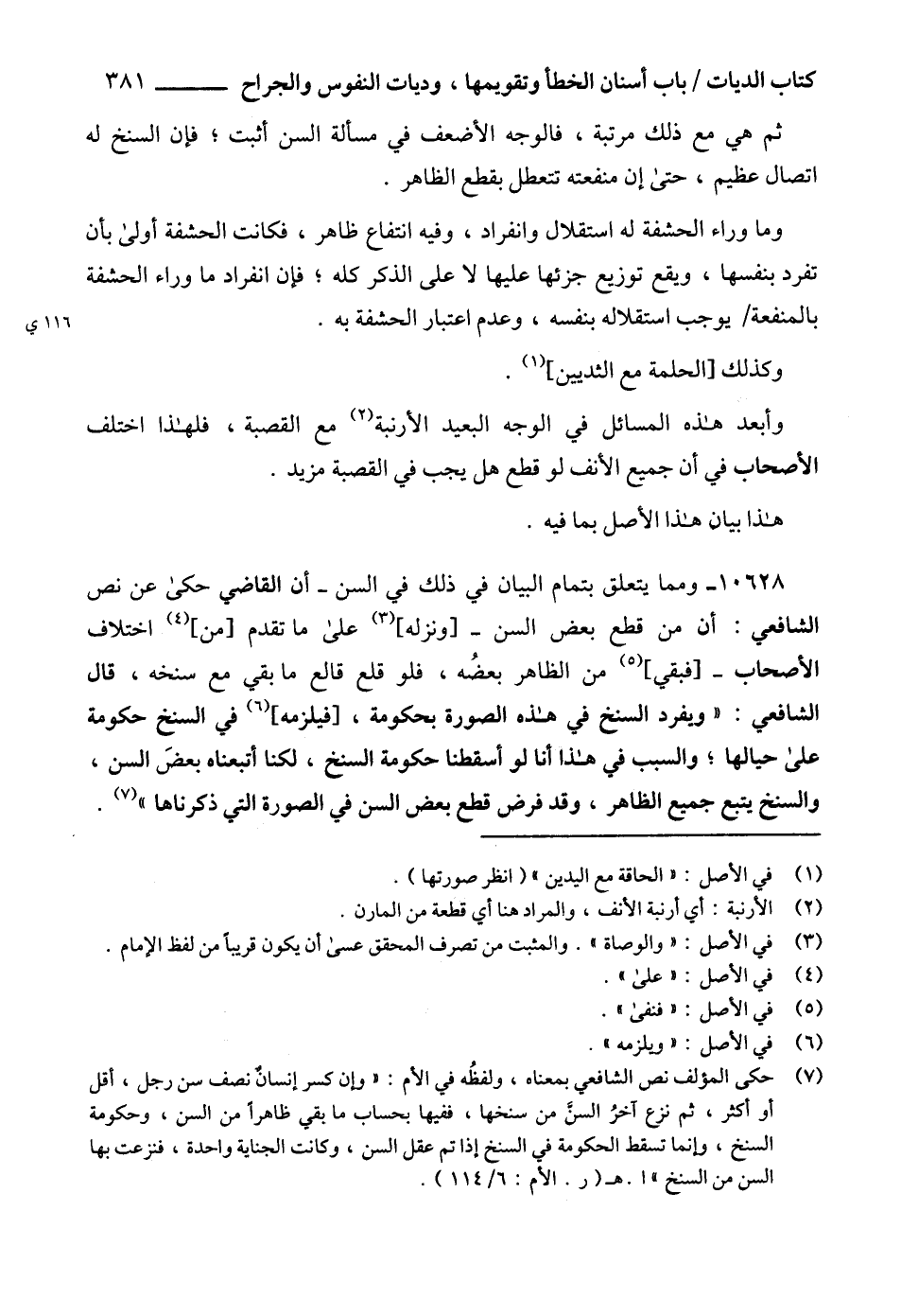(7) حكى المؤلف نص الشافعي بمعناه، ولفظُه في الأم: "وإن كسر إنسانٌ نصف سن رجل، أقل أو أكثر، ثم نزع أخرُ السنَّ من سنخها، ففيها بحساب ما بقي ظاهراً من السن، وحكومة السنخ، وانما تسقط الحكومة في السنخ إذا تم عقل السن، وكانت الجناية واحدة، فنزعت بها السن من السنخ" ا. هـ (ر. الأم: 6/ 114).