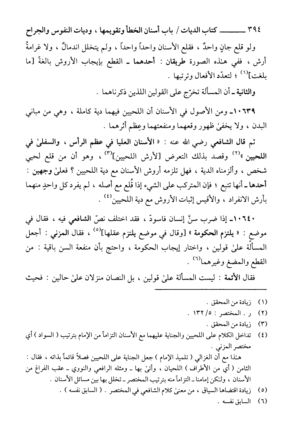 هذا مع أن الغزالي (تلميذ الإمام) جعل الجناية على اللحيين فصلاً قائماً بذاته، فقال: الثامن (أي من الأطراف) اللحيان، وأتى بها -ومثله الرافعي والنووي- عقب الفراغ من الأسنان، ولكن إمامنا -التزاماً منه بترتيب المختصر- تخلل بها بين مسائل الأسنان.