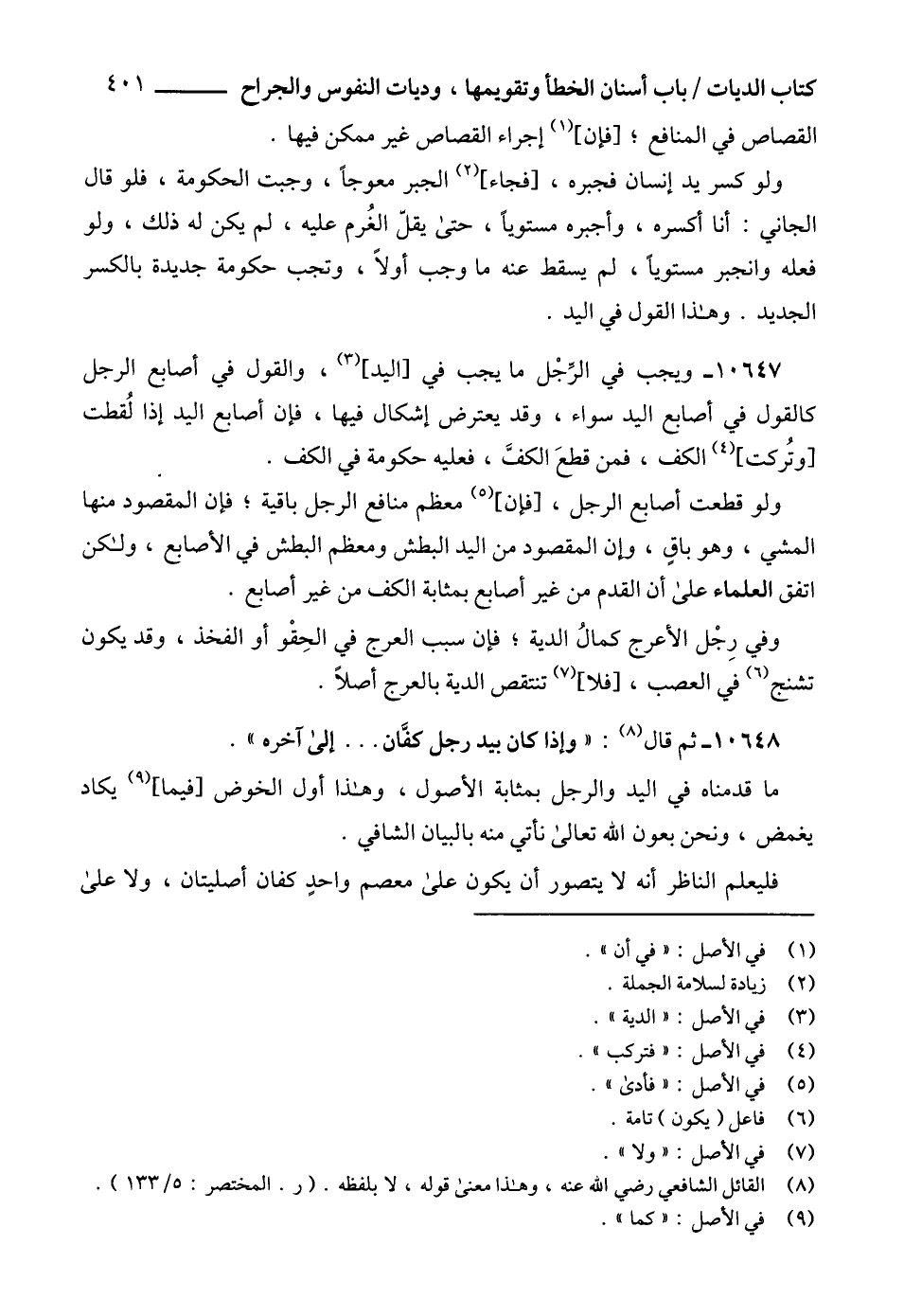 10647 - ويجب في الرِّجْل ما يجب في [اليد] (3)، والقول في أصابع الرجل كالقول في أصابع اليد سواء، وقد يعترض إشكال فيها، فإن أصابع اليد إذا لُقطت [وتُركت] (4) الكف، فمن قطعَ الكفَّ، فعليه حكومة في الكف.