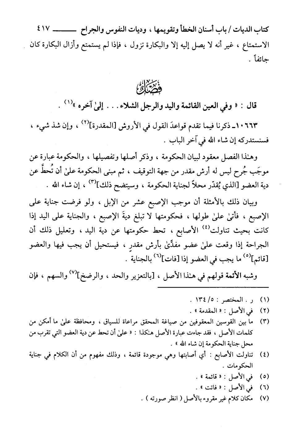 (3) ما بين القوسين المعقوفين من صياغة المحقق مراعاة للسياق، ومحافظة على ما أمكن من كلمات الأصل، فقد جاءت عبارة الأصل هكذا: "على أن تحط عن دية العضو التي تقرب من محل جناية الحكومة إن شاء الله".