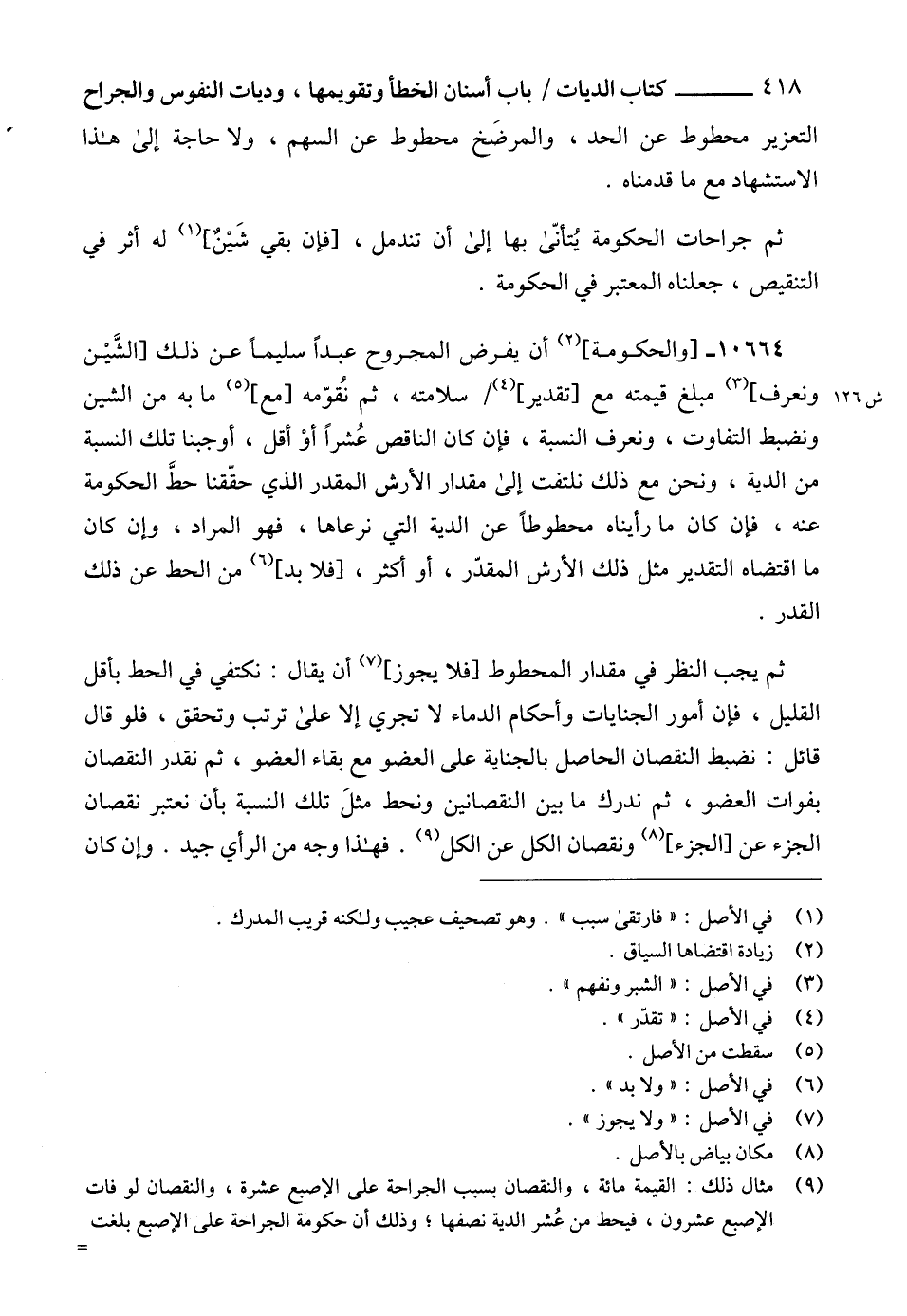 10664 - [والحكومة] (2) أن يفرض المجروح عبداً سليماً عن ذلك [الشَّيْن ونعرف] (3) مبلغ قيمته مع [تقدير] (4) سلامته، ثم نُقوّمه [مع] (5) ما به من الشين ونضبط التفاوت، ونعرف النسبة، فإن كان الناقص عُشراً أوْ أقل، أوجبنا تلك النسبة من الدية، ونحن مع ذلك نلتفت إلى مقدار الأرش المقدر الذي حقّقنا حطَّ الحكومة عنه، فإن كان ما رأيناه محطوطاً عن الدية التي نرعاها، فهو المراد، وإن كان ما اقتضاه التقدير مثل ذلك الأرش المقدّر، أو أكثر، [فلا بد] (6) من الحط عن ذلك القدر.
