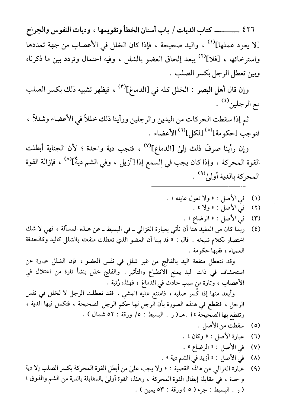 (9) عبارة الغزالي عن هذه القضية: "ولا يجب على من أبطل القوة المحركة بكسر الصلب إلا دية واحدة، في مقابلة إبطال القوة المحركة، وهذه القوة أولى بالمقابلة بالدية من الشم والذوق" (ر. البسيط: جزء (5) ورقة: 53 يمين).