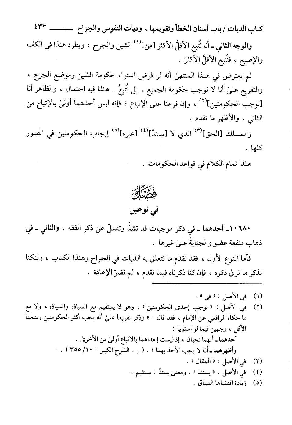 (2) في الأصل: "نوجب إحدى الحكومتين". وهو لا يستقيم مع السباق والسياق، ولا مع ما حكاه الرافعي عن الإمام، ففد قال: "وذكر تفريعاً على أنه يجب أكثر الحكومتين ويتبعها الأقل، وجهين فيما لو استويا: أحدهما - أنهما تجبان، إذ ليست إحداهما بالاتباع أولى من الأخرى.