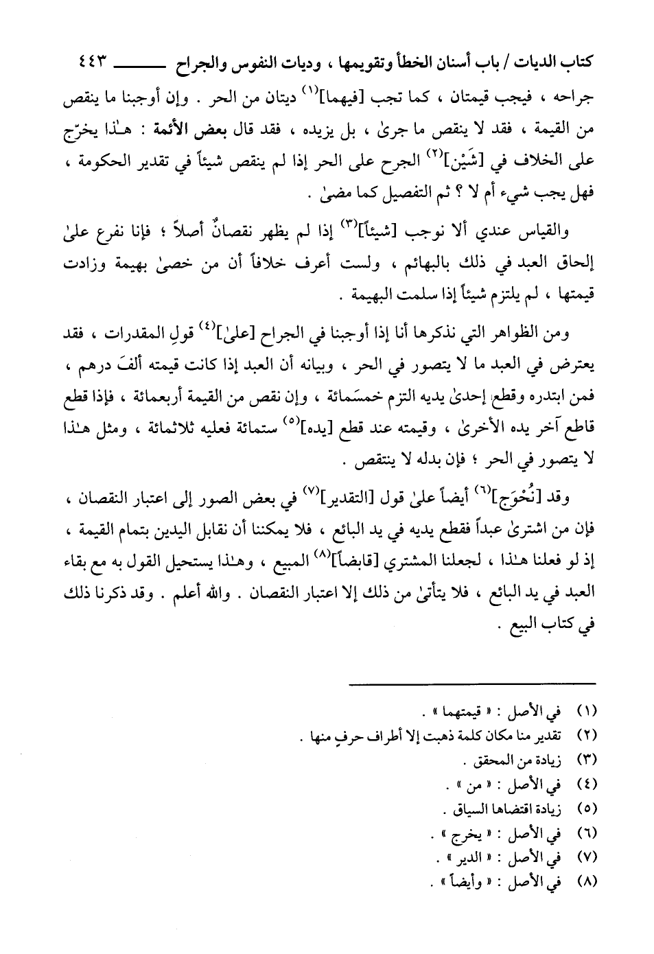 ومن الظواهر التي نذكرها أنا إذا أوجبنا في الجراح [على] (4) قولِ المقدرات، فقد يعترض في العبد ما لا يتصور في الحر، وبيانه أن العبد إذا كانت قيمته ألفَ درهم، فمن ابتدره وقطع اإحدى يديه التزم خمسَمائة، وإن نقص من القيمة أربعمائة، فإذا قطع قاطع آخر يده الأخرى، وقيمته عند قطع [يده] (5) ستمائة فعليه ثلاثمائة، ومثل هذا لا يتصور في الحر؛ فإن بدله لا ينتقص.