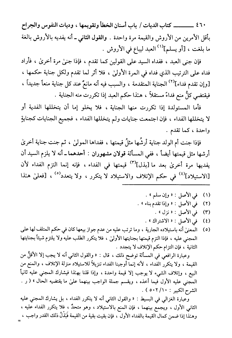 (5) المعنى أنه باستيلاده الجارية، وما ترتب عليه من عدم جواز بيعها كان في حكم المتلف لها على المجني عليه، فإذا التزم قيمتها بجنايتها الأولى، فلا يتكرر الطلب عليه ولا يلتزم شيئاًَ بجنايتها الثانية، فإن التزام حكم الإتلاف لا يتجدد.