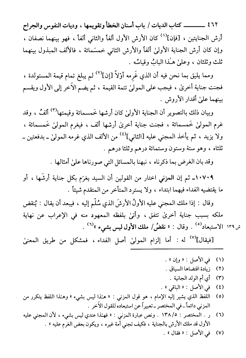 (6) ر. المختصر: 5/ 138. ونص عبارة المزني: "فهذا عندي ليس بشيء، لأن المجني عليه الأول قد ملك الأرش بالجناية، فكيف تجني أمة غيره، ويكون بعض الغرم عليه".