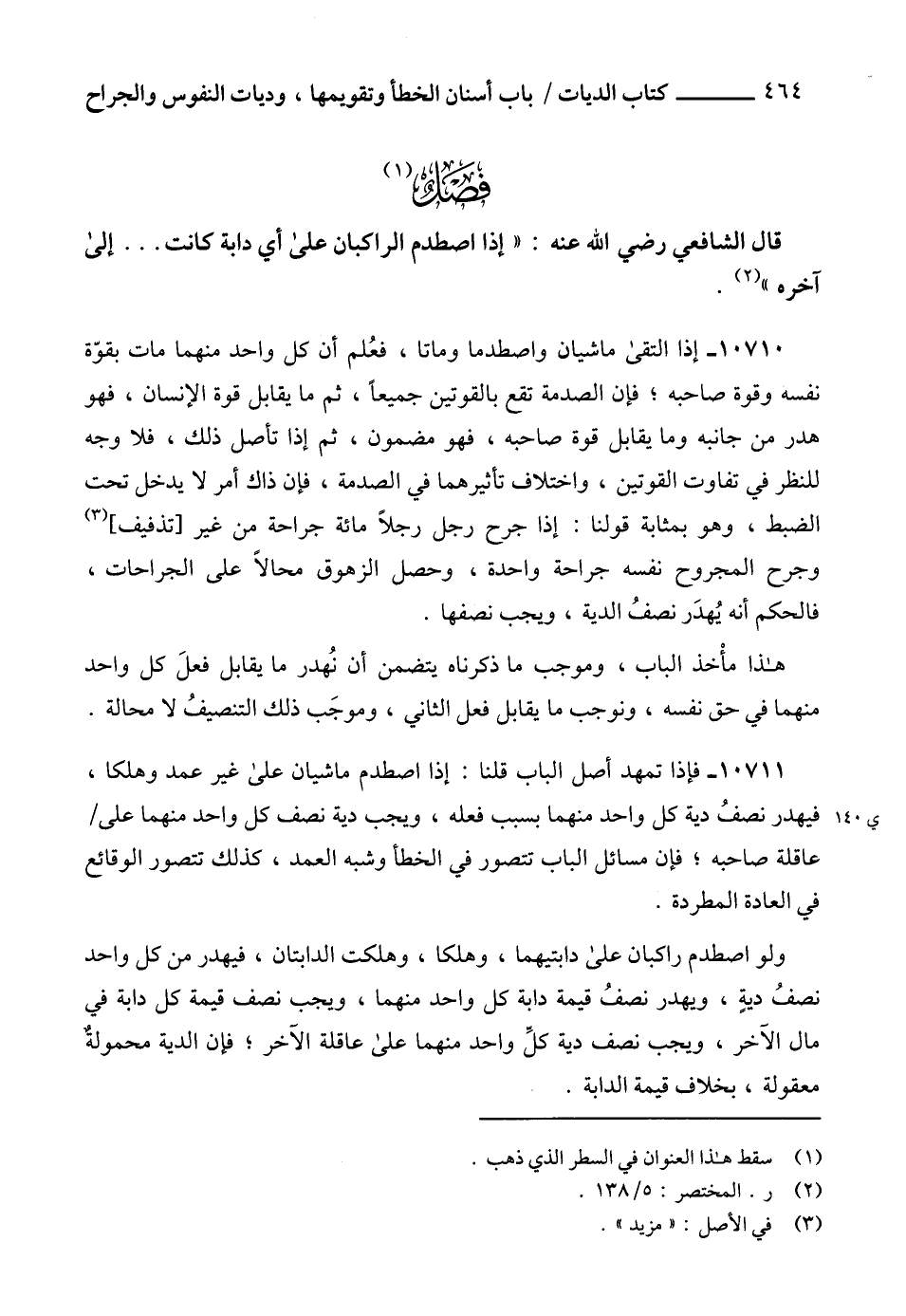 10711 - فإذا تمهد أصل الباب قلنا: إذا اصطدم ماشيان على غير عمد وهلكا، فيهدر نصفُ دية كل واحد منهما بسبب فعله، ويجب دية نصف كل واحد منهما على عاقلة صاحبه؛ فإن مسائل الباب تتصور في الخطأ وشبه العمد، كذلك تتصور الوقائع في العادة المطردة.