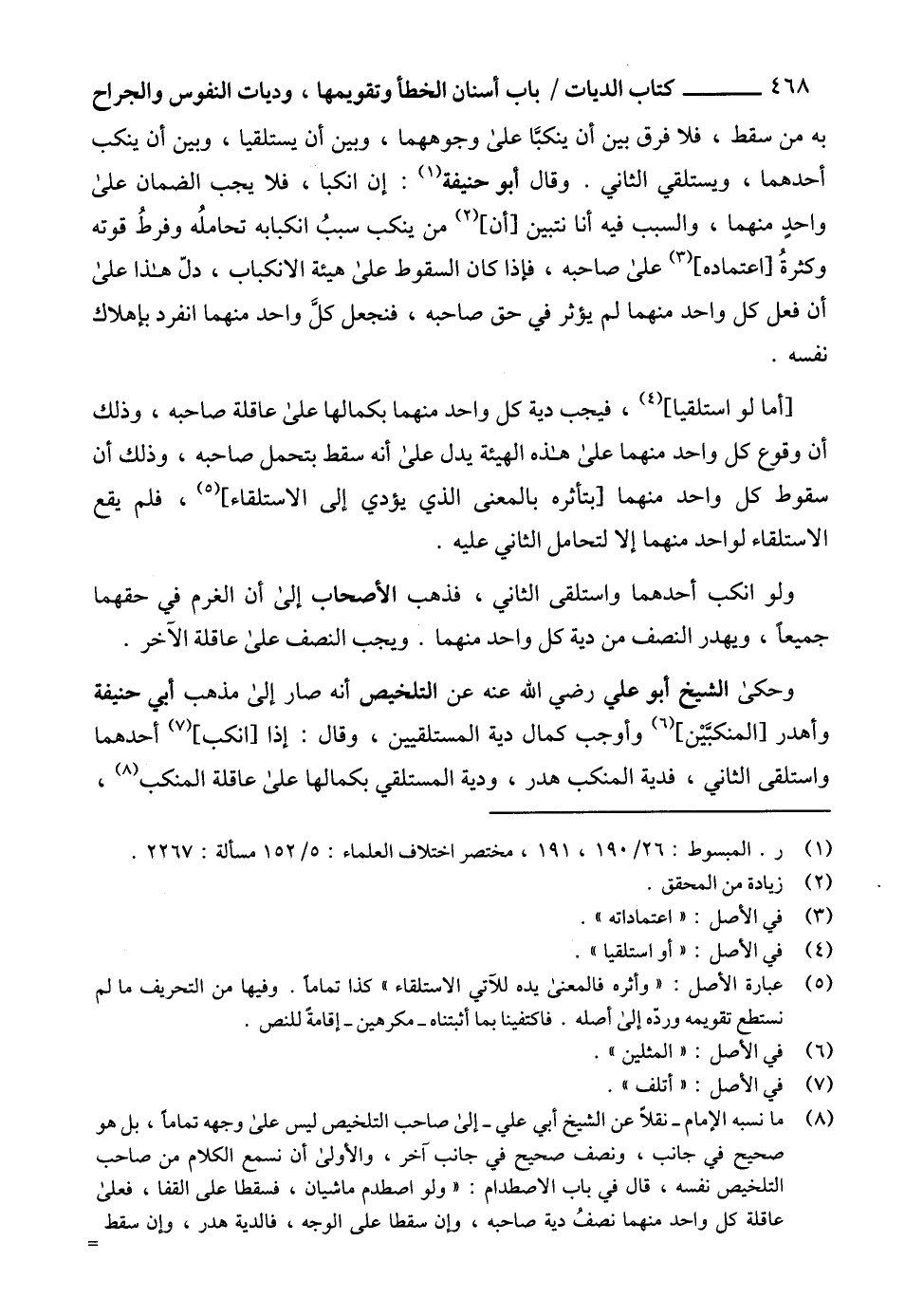 (8) ما نسبه الإمام -نقلاً عن الشيخ أبي علي- إلى صاحب التلخيص ليس على وجهه تماماً، بل هو صحيح في جانب، ونصف صحيح في جانب آخر، والأولى أن نسمع الكلام من صاحب التلخيص نفسه، قال في باب الاصطدام: "ولو اصطدم ماشيان، فسقطا على القفا، فعلى عاقلة كل واحد منهما نصفُ دية صاحبه، وإن سقطا على الوجه، فالدية هدر، وان سقط =