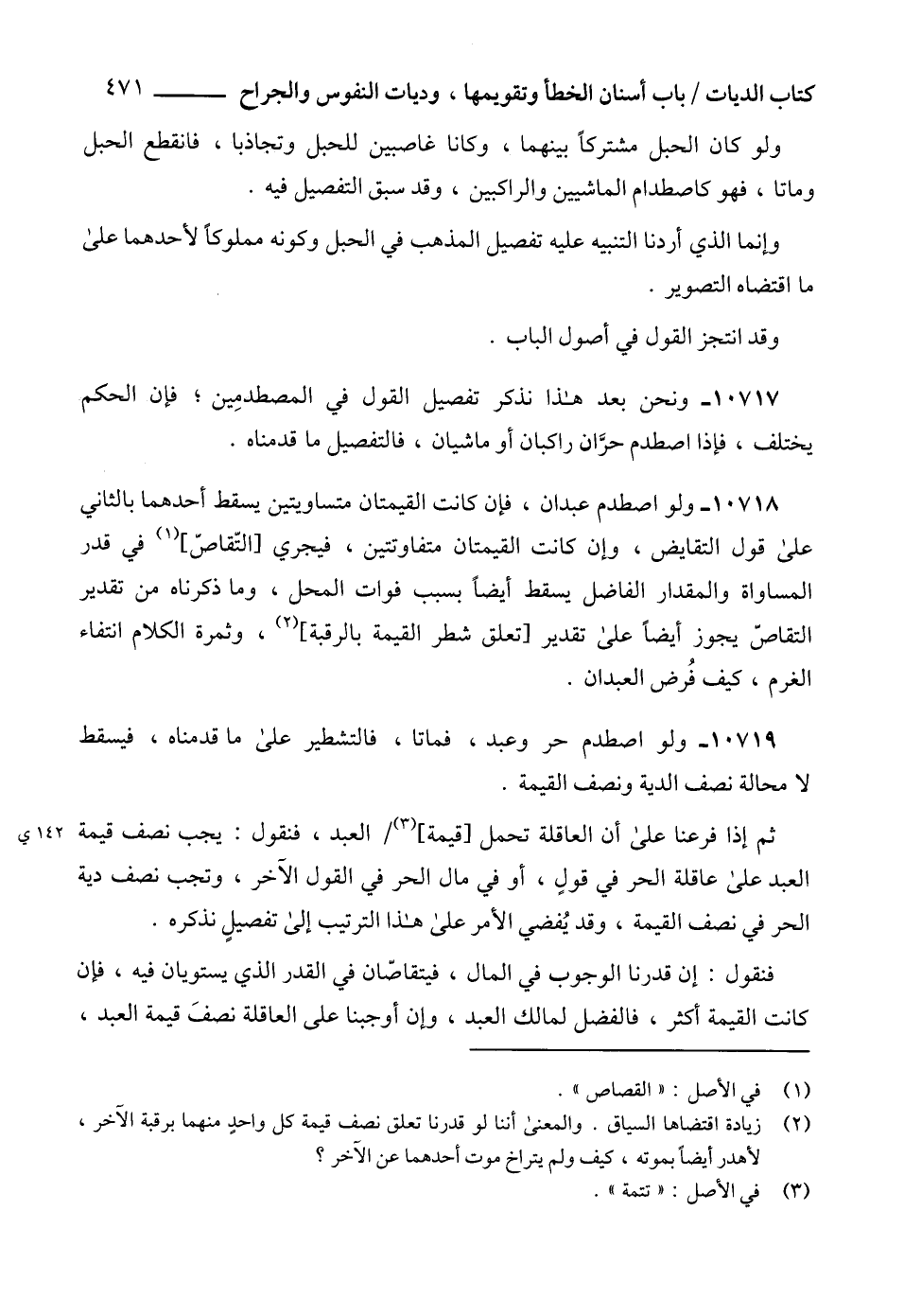 (2) زيادة اقتضاها السياق. والمعنى أننا لو قدرنا تعلق نصف قيمة كل واحدٍ منهما برقبة الآخر، لأهدر أيضاًً بموته، كيف ولم يتراخ موت أحدهما عن الآخر؟