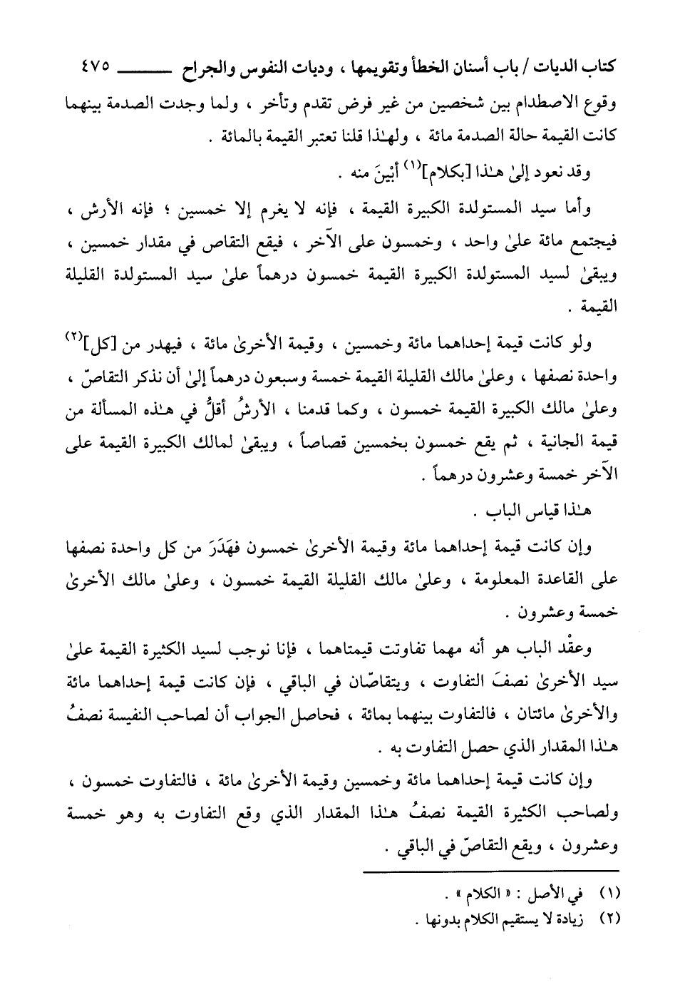 ولو كانت قيمة إحداهما مائة وخمسين، وقيمة الأخرى مائة، فيهدر من [كل] (2) واحدة نصفها، وعلى مالك القليلة القيمة خمسة وسبعون درهماً إلى أن نذكر التقاصّ، وعلى مالك الكبيرة القيمة خمسون، وكما قدمنا، الأرشُ أقلّ في هذه المسألة من قيمة الجانية، ثم يقع خمسون بخمسين قصاصاًً، ويبقى لمالك الكبيرة القيمة على الآخر خمسة وعشرون درهماً.