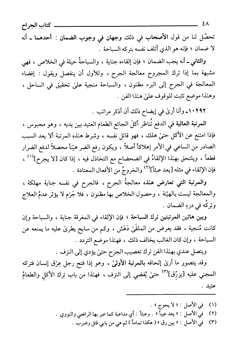والمرتبة التي تعارض هذه معالجةُ الجرح، فالجرح في نفسه جناية مهلكة، والمعالجة ليست بالهيّنة، وحصول الخلاص بها مظنون، فلا جَرَم لا يؤثر عدمُ العلاج وتركُه في درءِ الضمان.