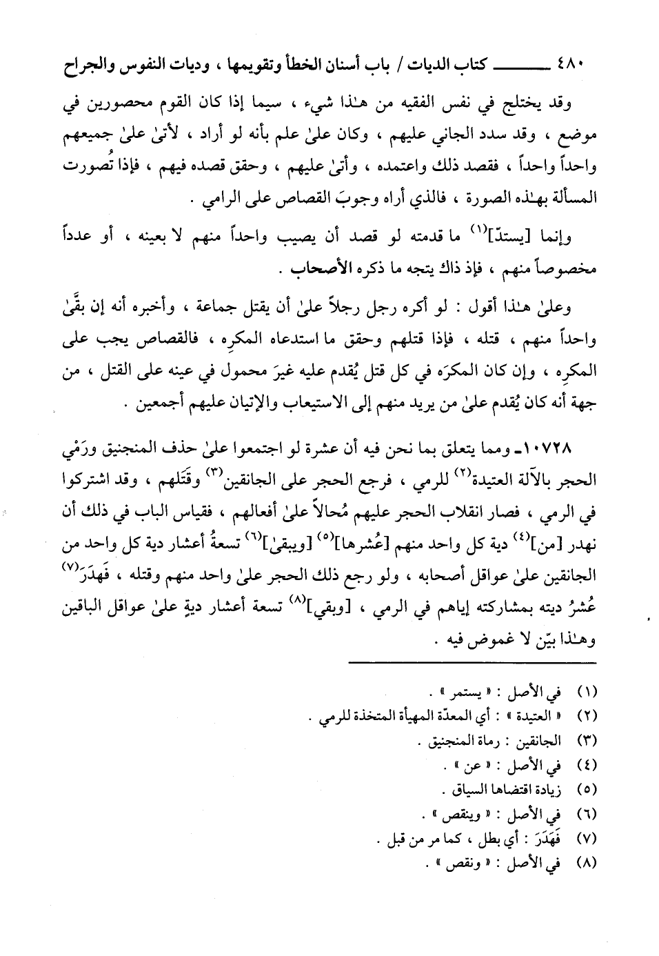 10728 - ومما يتعلق بما نحن فيه أن عشرة لو اجتمعوا على حذف المنجنيق ورَمْي الحجر بالآلة العتيدة (2) للرمي، فرجع الحجر على الجانقين (3) وقَتَلهم، وقد اشتركوا في الرمي، فصار انقلاب الحجر عليهم مُحالاً على أفعالهم، فقياس الباب في ذلك أن نهدر [من] (4) دية كل واحد منهم [عُشرها] (5) [ويبقى] (6) تسعةُ أعشار دية كل واحد من الجانقين على عواقل أصحابه، ولو رجع ذلك الحجر على واحد منهم وقتله، فَهدَرَ (7) عُشرُ ديته بمشاركته إياهم في الرمي، [وبقي] (8) تسعة أعشار ديةٍ على عواقل الباقين وهذا بيّن لا غموض فيه.